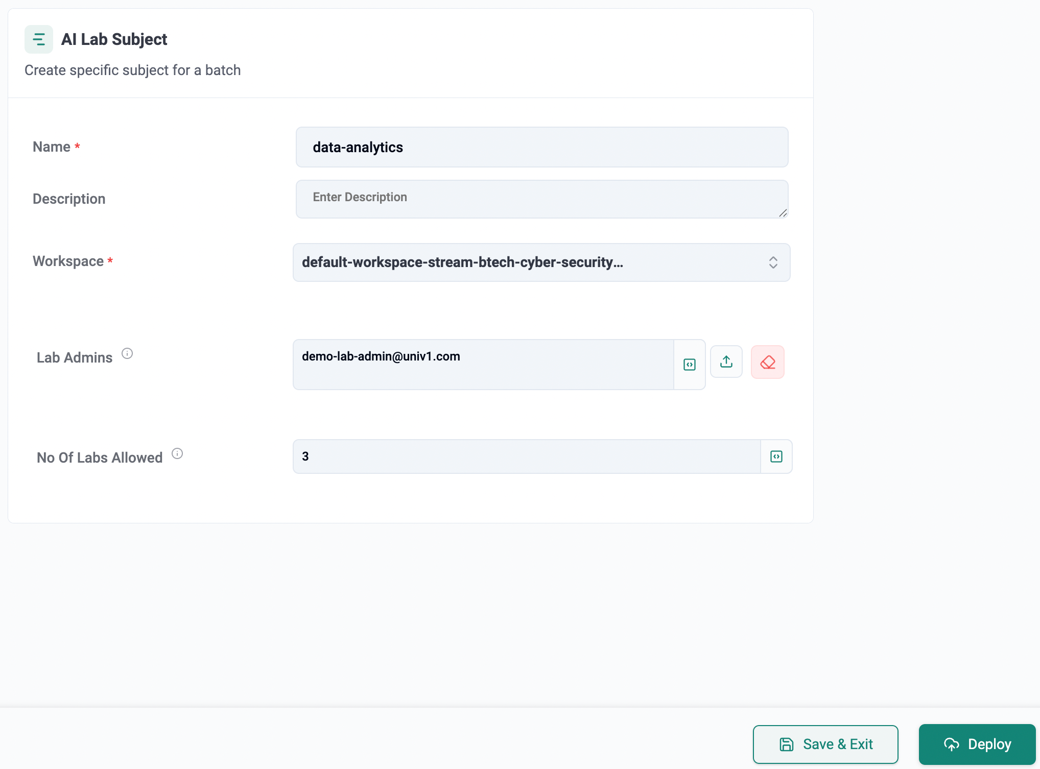 | Number of Labs Allowed | Specifies the maximum number of batches that can be created under a subject. A batch represents a group of students attending lab sessions at a particular time slot (for example, Monday 10–12, Daily 3–5, etc.). Since each batch consumes SKUs (notebooks, GPUs, VMs), this field acts as a quota to control how many batches a subject is permitted to create. |