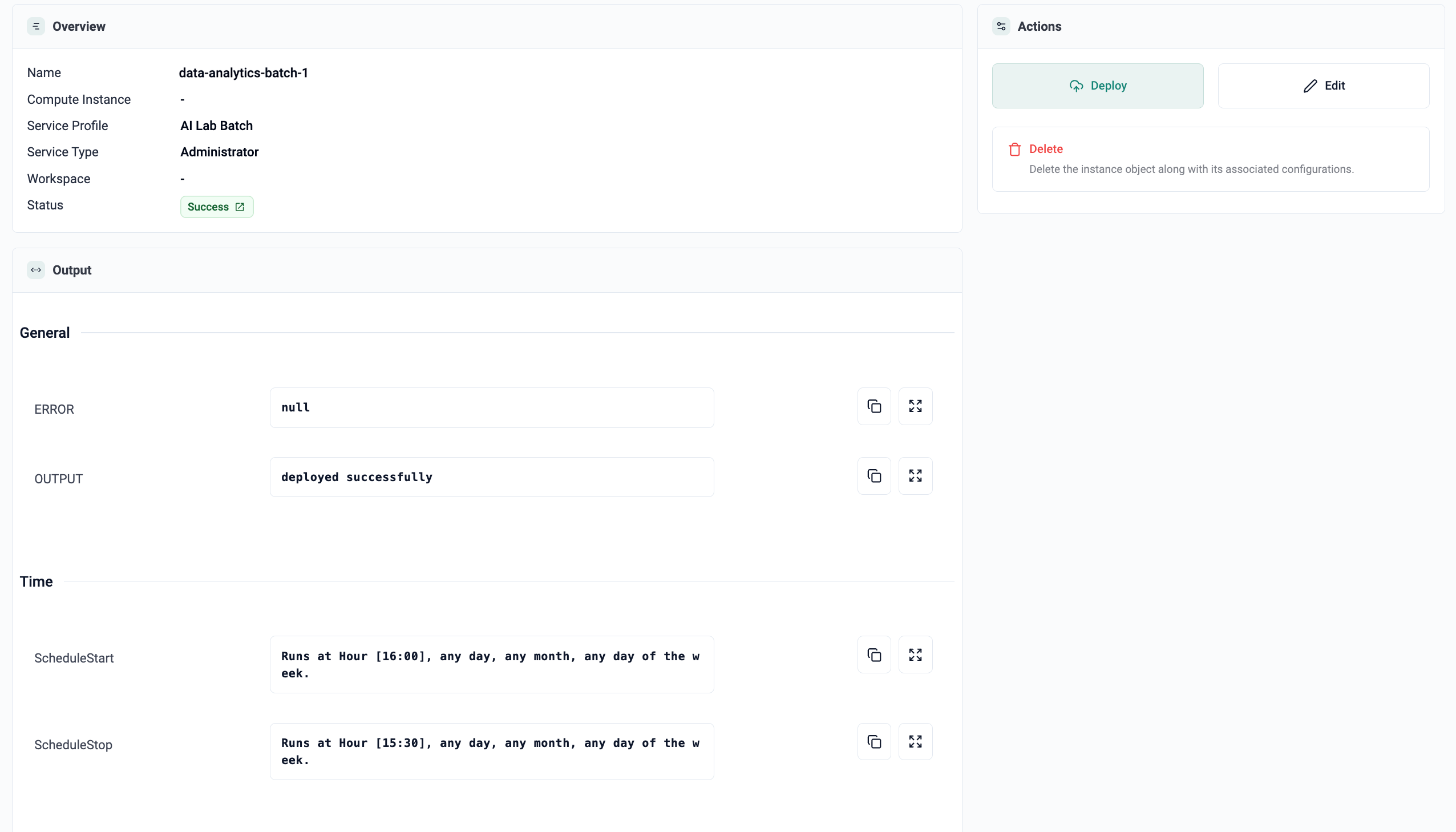 After the Lab Admin submits the batch configu ration, the deployment status and output are displayed. This confirms whether the batch has been created successfully under the subject project.