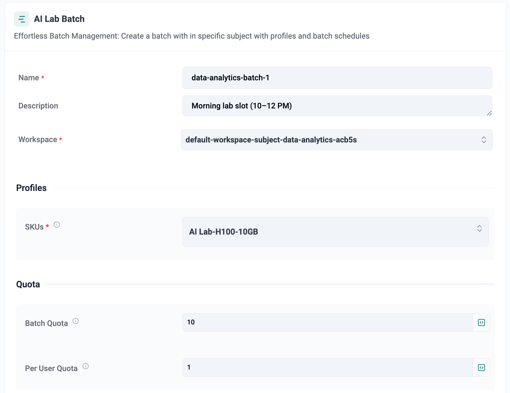 | Batch Quota | Total number of notebook instances allowed under this batch. Controls overall capacity. | 10 (10 students × 1 notebook each) |