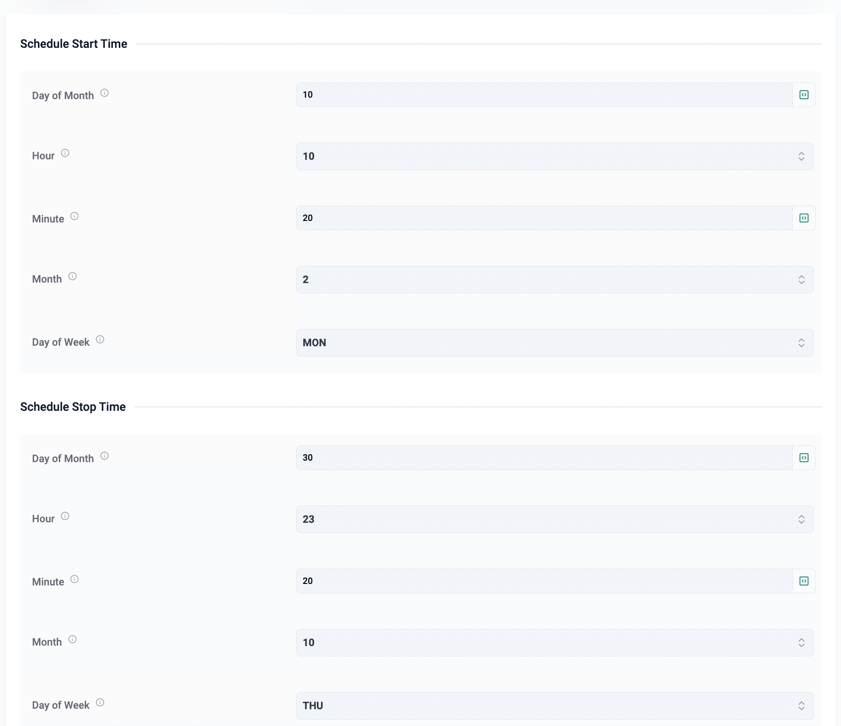 | Day of Month | The calendar date on which batch resources should stop. When set, the deactivation happens only on that date each month. | 30 |