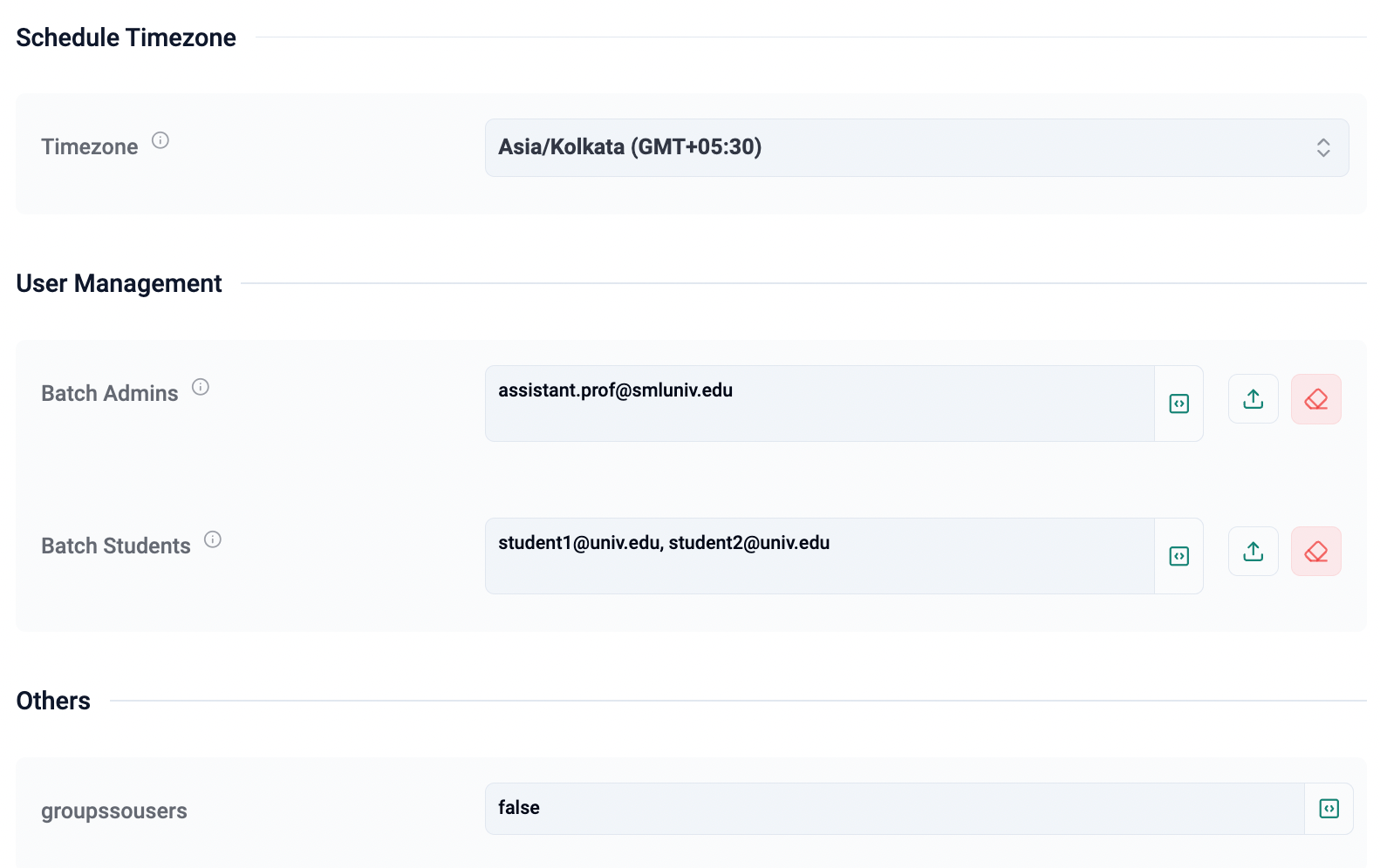 | Batch Admins | Email IDs of users who manage the batch. Must be existing users. Comma-separated values or CSV supported. | assistant.prof@smluniv.edu |