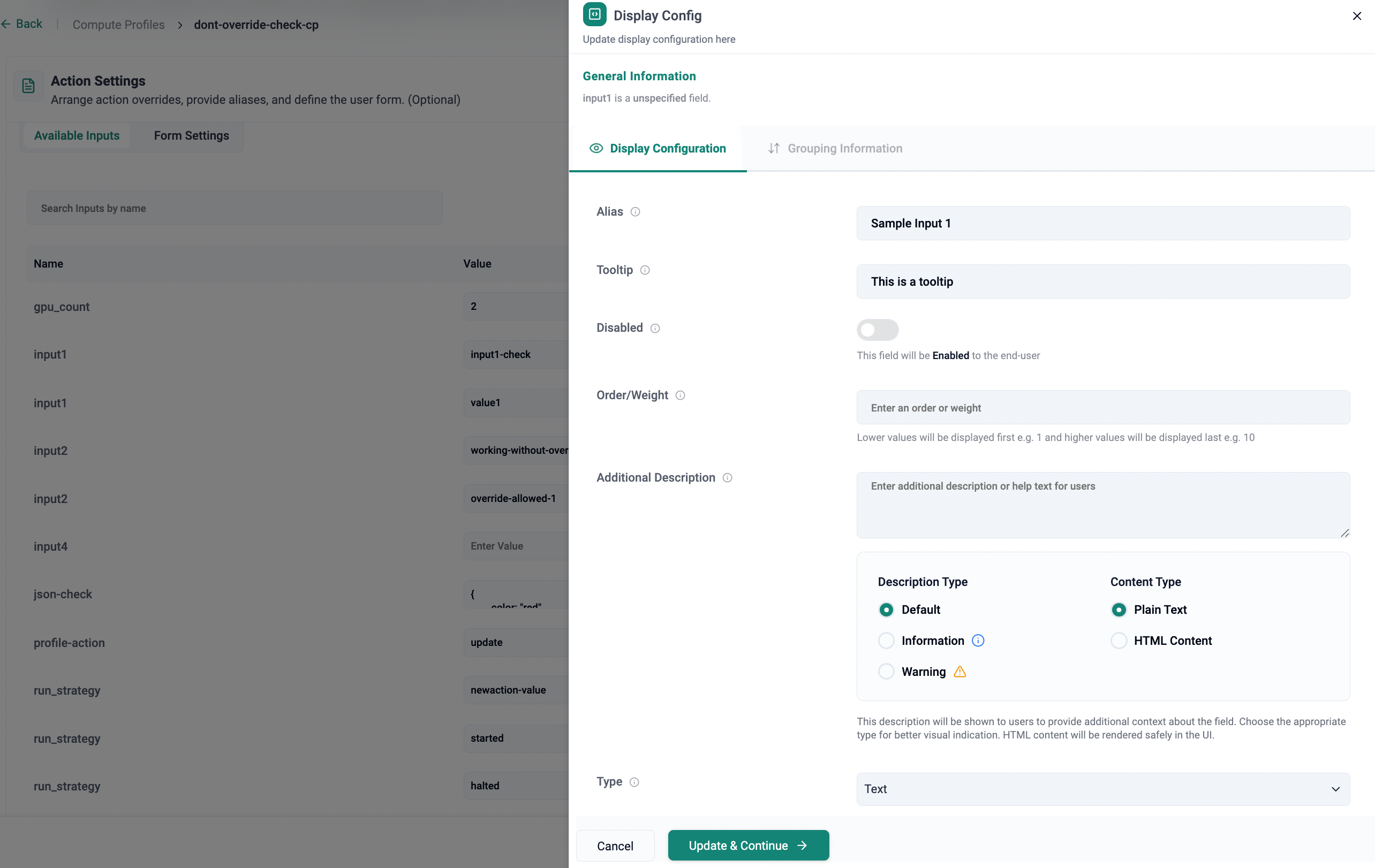 These configurations are stored per action, ensuring each action can have distinct customization based on its function and context. For example, a variable such as gpu_count with value 1 can be locked by disabling the Allow Override option, while another variable can be renamed or provided with a tooltip to enhance clarity.