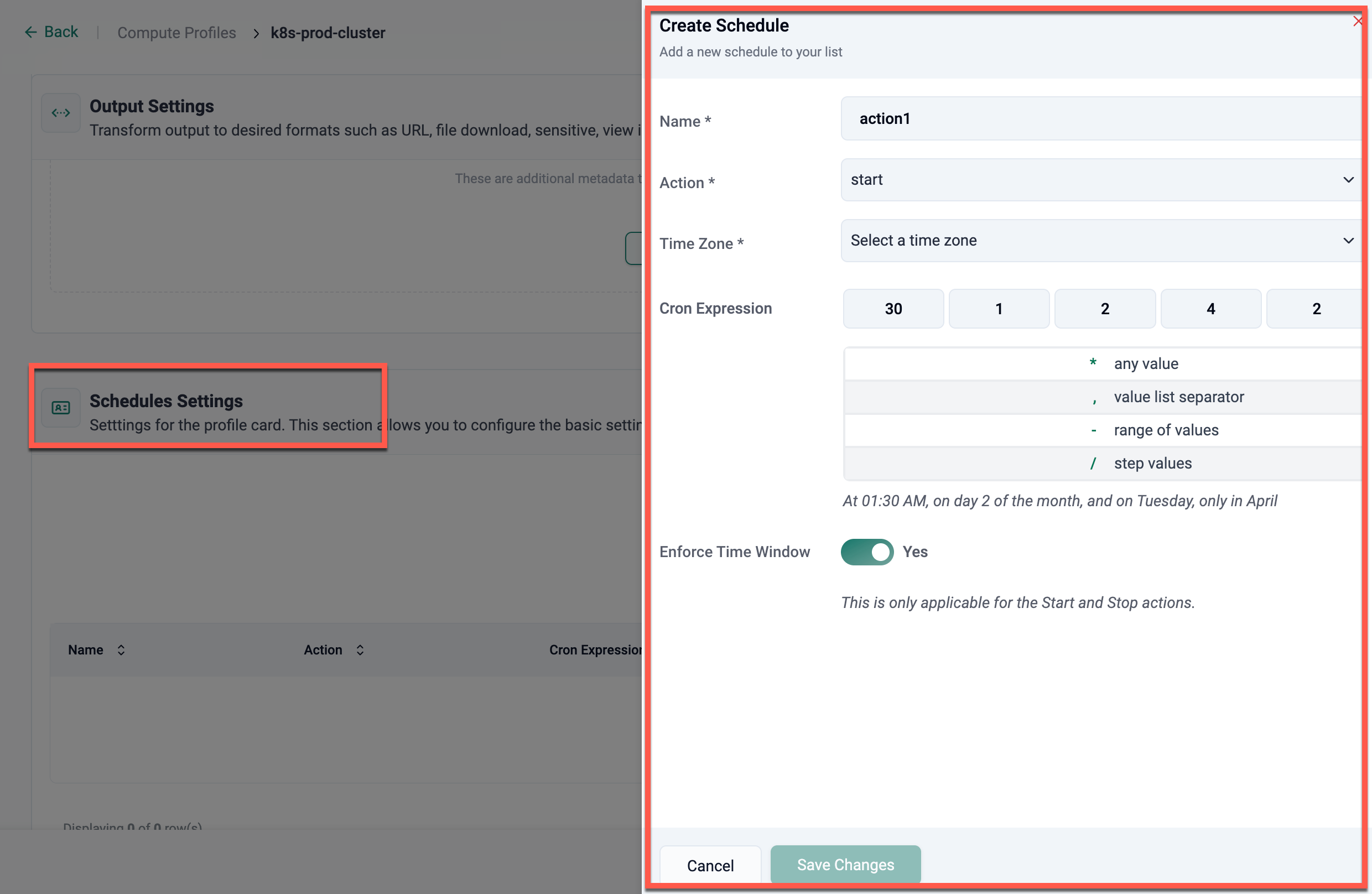 Once the schedule is configured, click Save Changes to add it to the compute profile. All schedules defined here will automatically apply to compute instances created using this profile.
