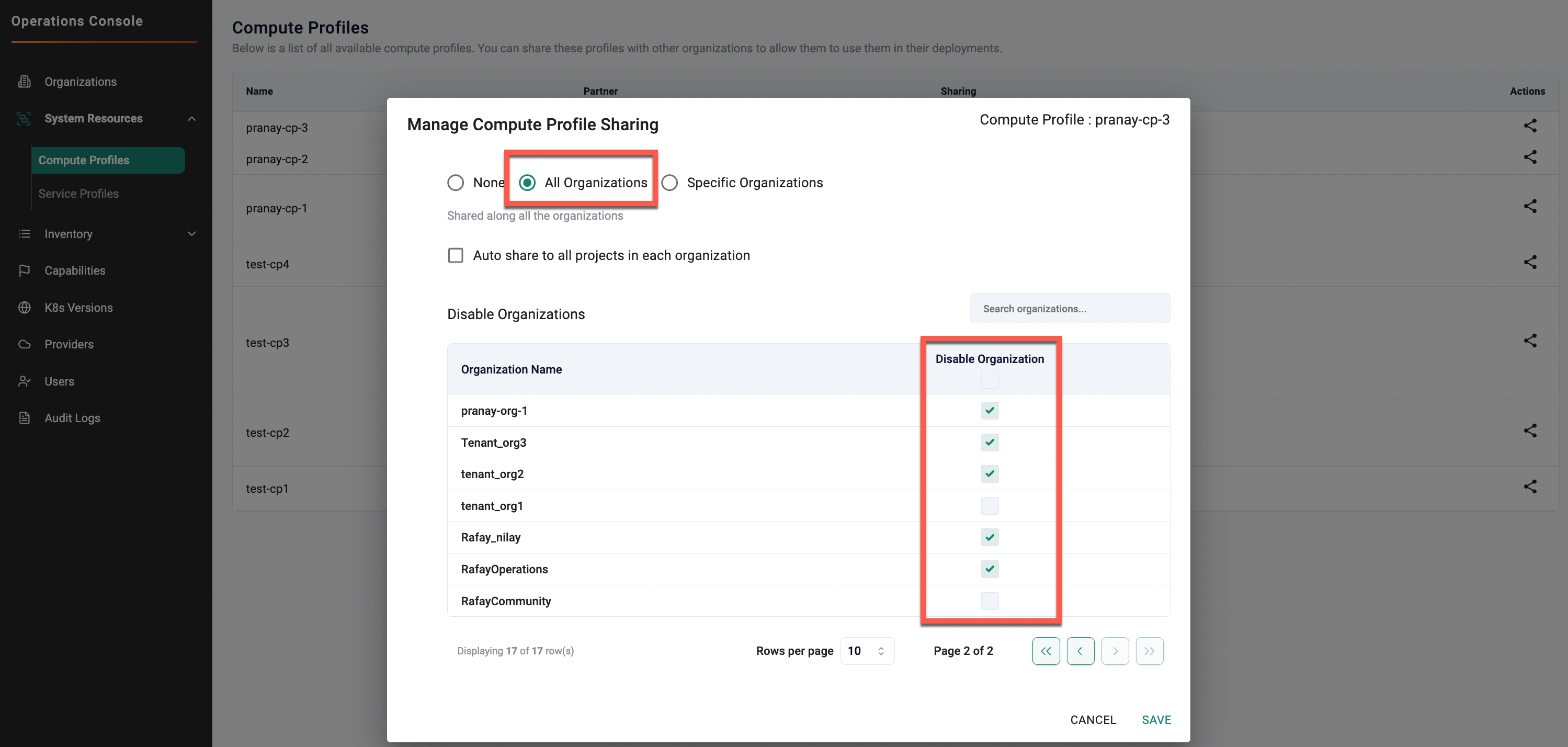 Disable Organizations: When enabled for a specific organization, this setting excludes that organization from profile sharing when the profile is shared with all organizations. The profile is not available to the excluded organization or its projects.