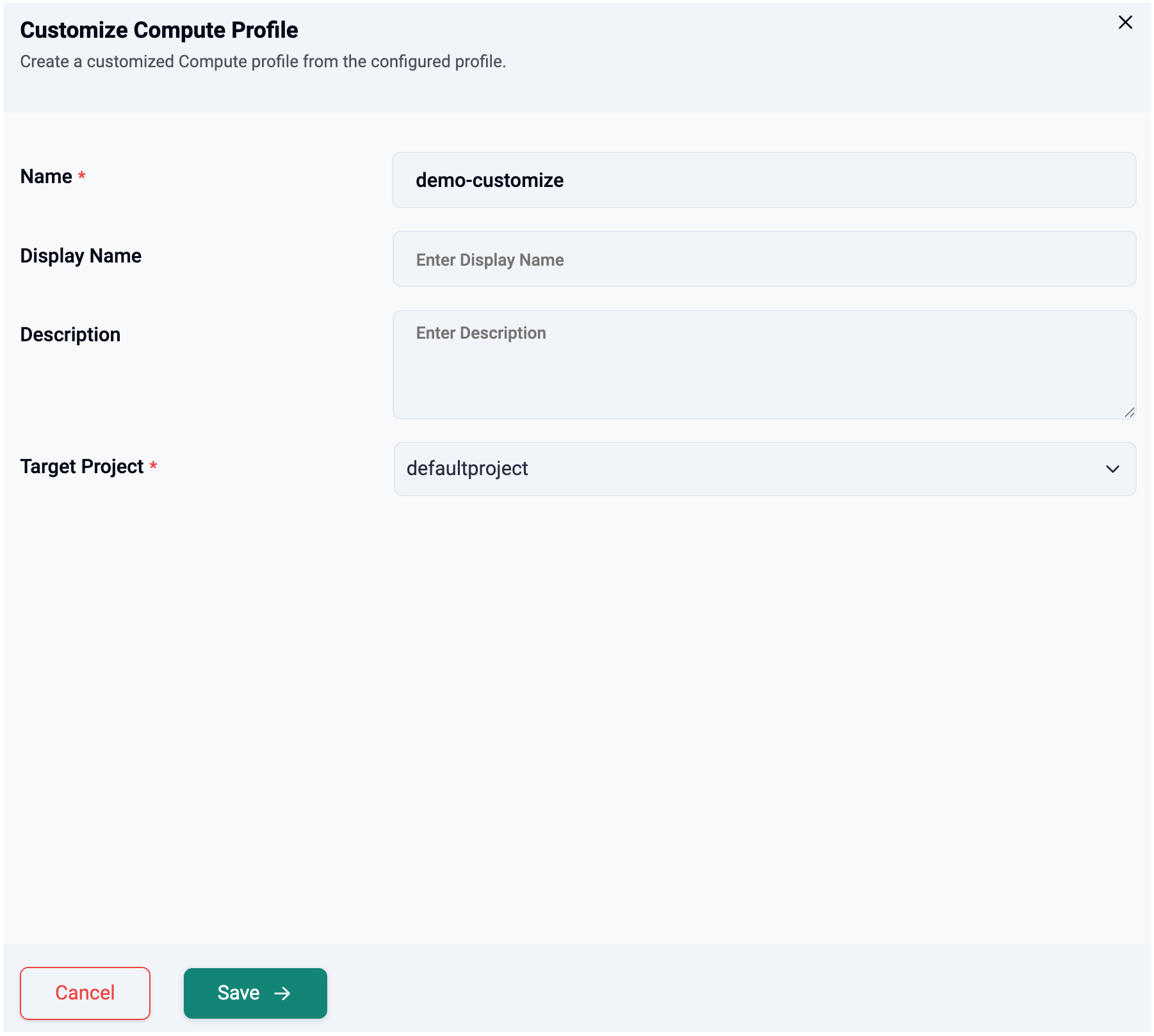 The following fields are available: * Name: Specifies the name for the customized profile. * Display Name (optional): Provides a user-friendly label for the profile. * Description (optional): Describes the purpose or variations of the customized profile. * Target Project: Indicates where the customized profile will be created within the tenant organization.