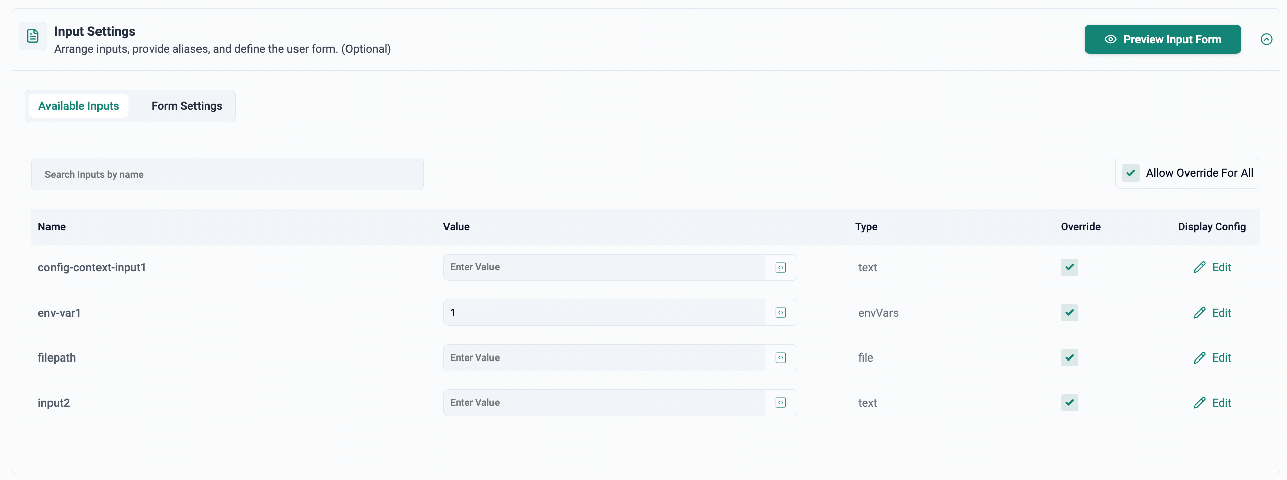 The Override option can be enabled for individual variables or for all variables using Allow Override For All. Only variables marked as overridable are available for customization when creating instances based on the tenant’s customized profile.