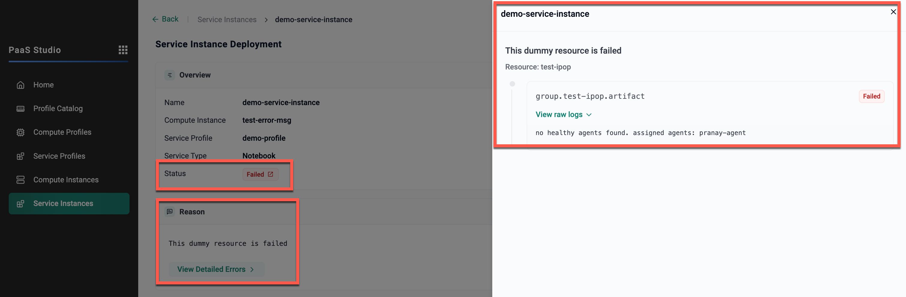 In this example, the environment includes a single resource with a custom deployment status annotation defined in its resource template. When the service instance deployment fails for that resource, the instance page displays the configured message “This dummy resource is failed” under the Reason section.