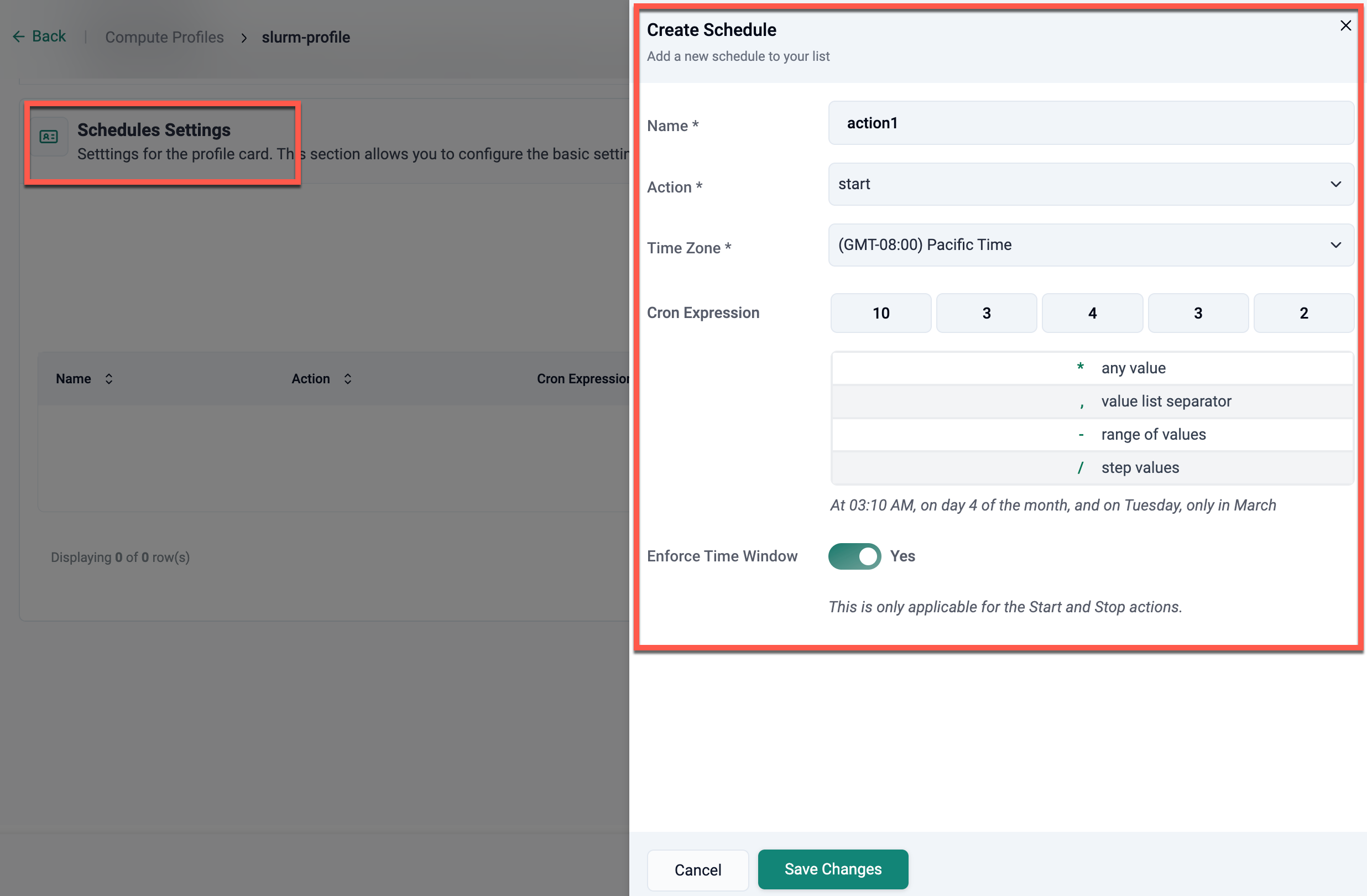 Once the schedule is configured, click Save Changes to add it to the compute profile. All schedules defined here will automatically apply to compute instances created using this profile.