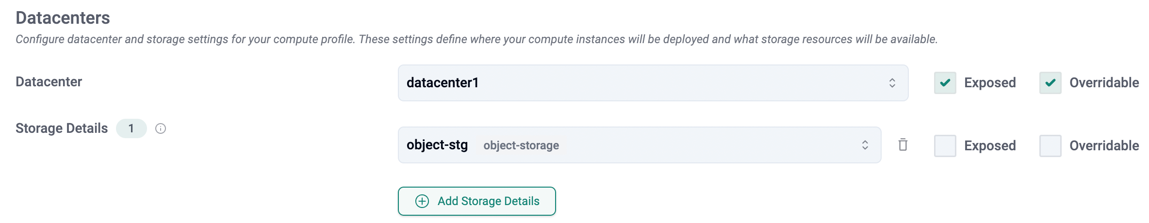 | Storage Details | — | list | Select one or more storage instances to attach to the compute profile. The options are automatically fetched from existing storage service instances. |
