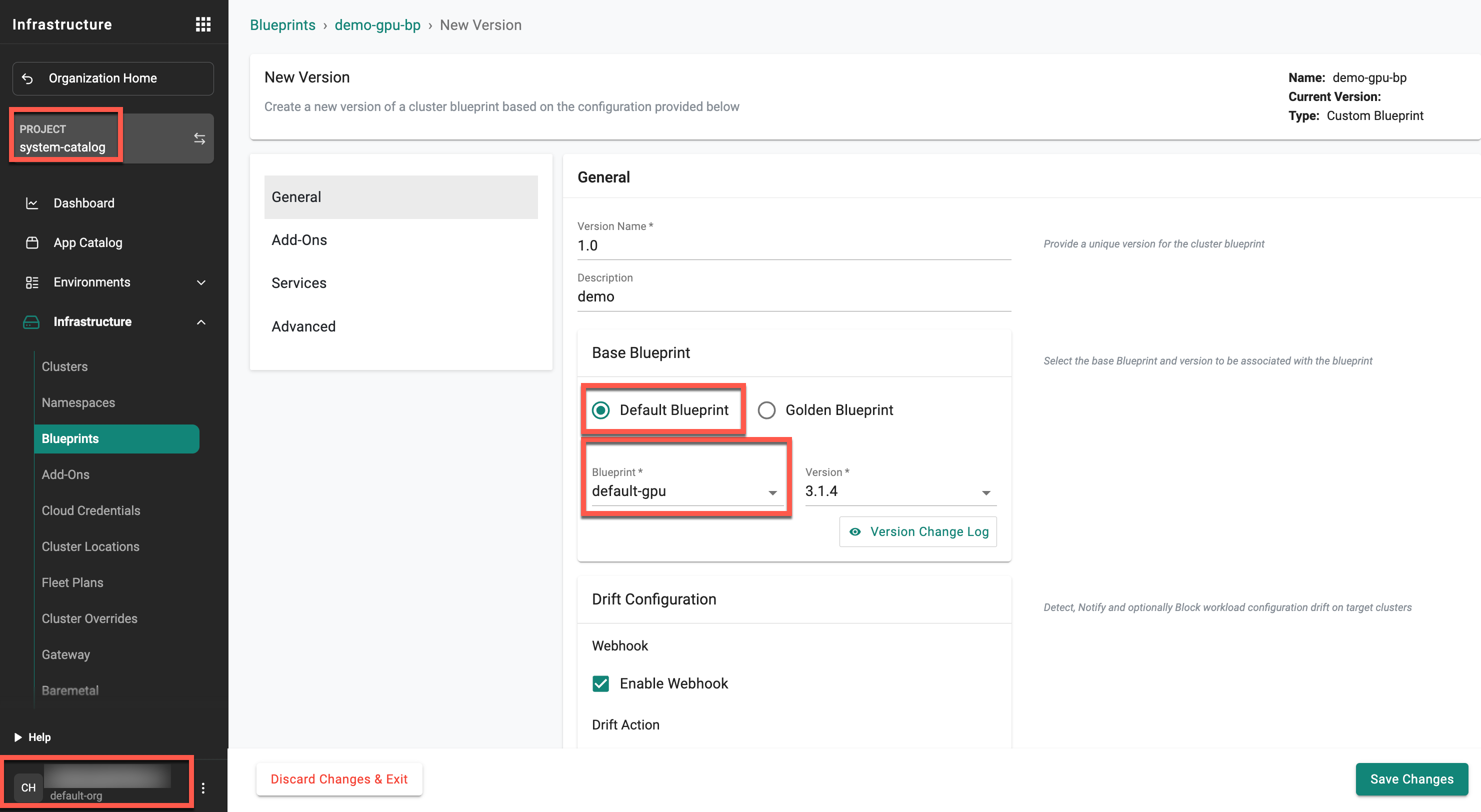 - Create a custom blueprint in the system-catalog project under the default-org