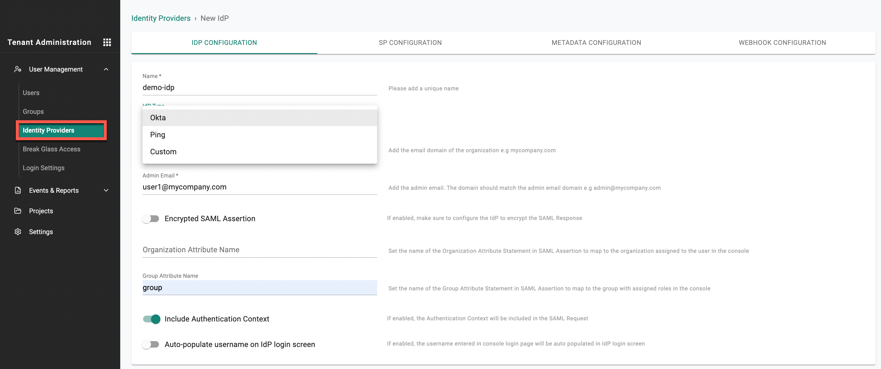 - Supported identity provider types include Okta, Ping, and Custom SAML-based providers.