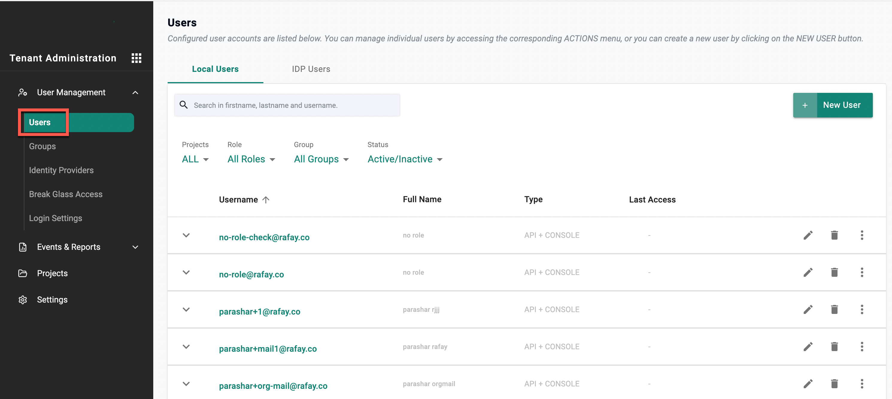 Local Users are created and managed directly within the platform. Tenant admins can create local users, assign Tenant Admin or lower PaaS roles, manage group membership, and control console or programmatic access.