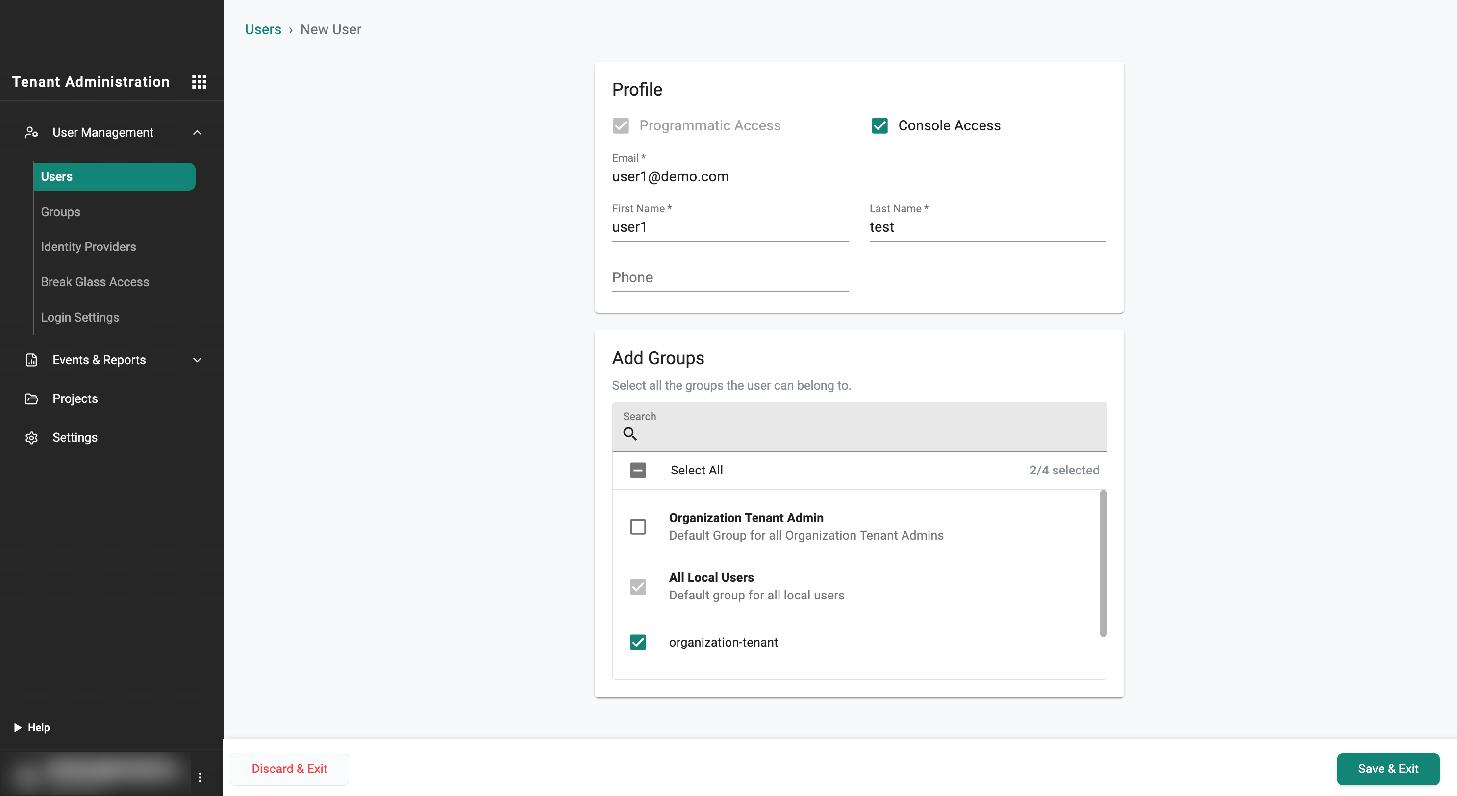 For existing users (local and IDP), tenant admins can: - Edit user profile details (local users only) - Update group and role assignments - Enable or disable user access - Remove users from the organization