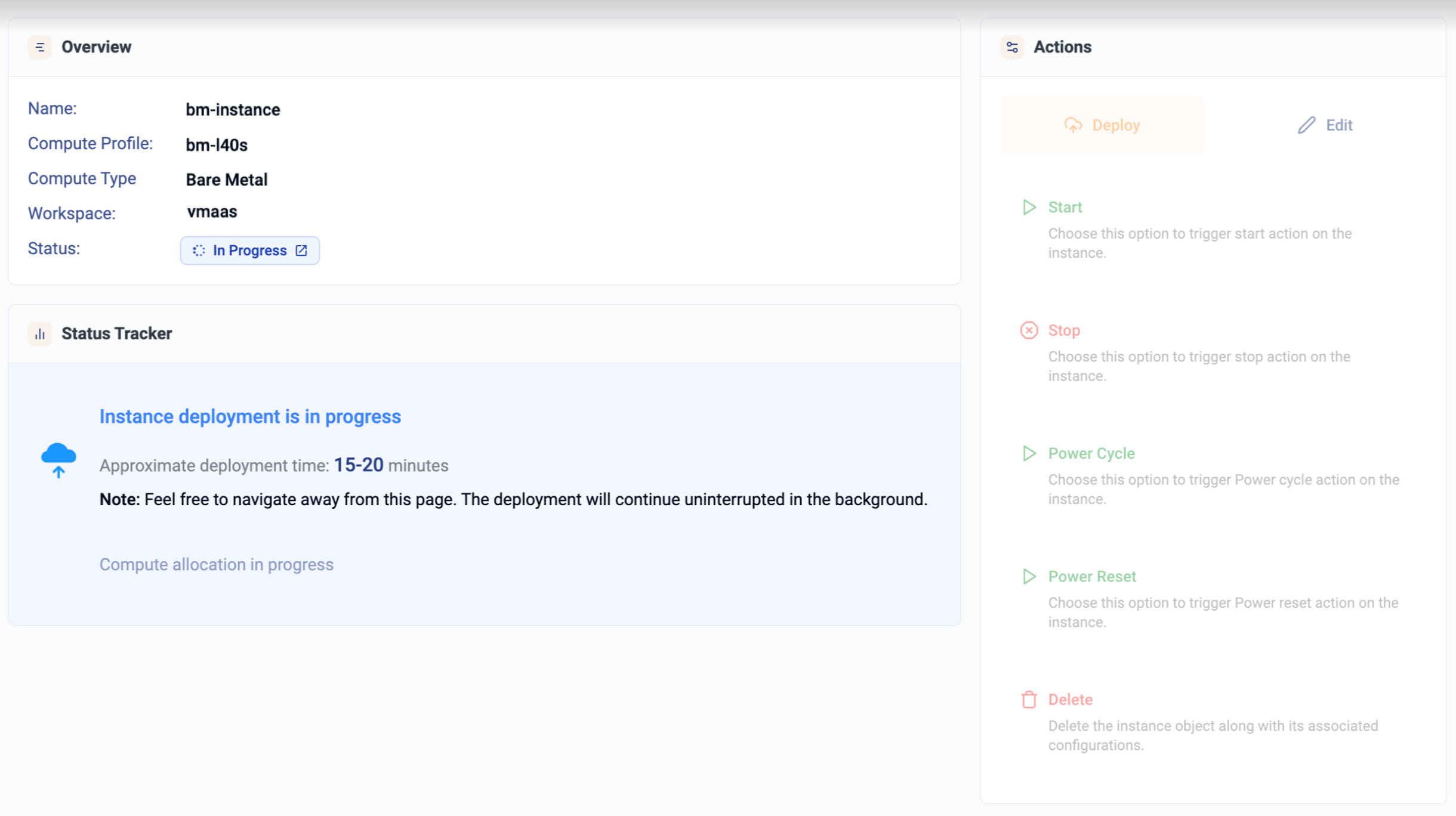 After a Bare Metal compute instance is deployed, various lifecycle operations can be performed from the Actions panel. The following options are available: