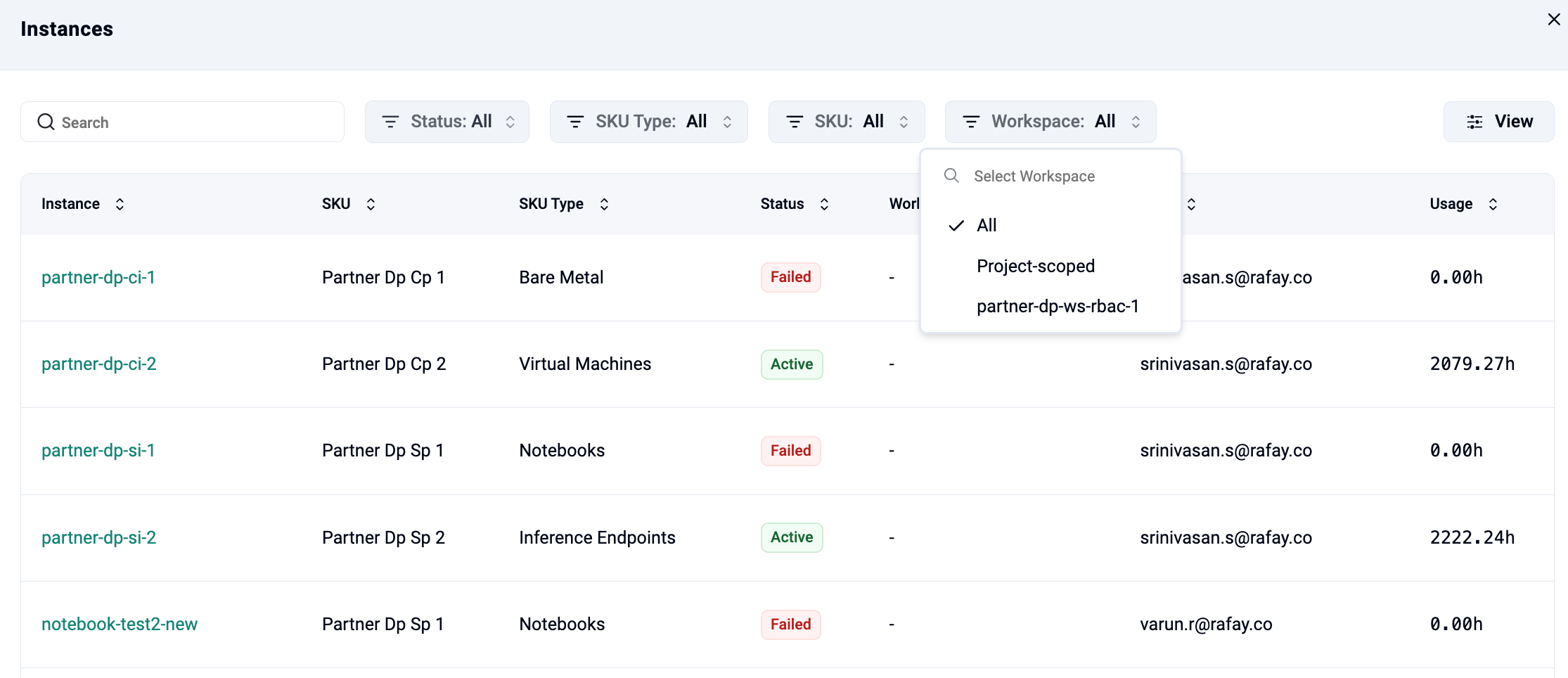 Each instance entry includes: - Instance: Name of the instance - SKU: SKU used by the instance - SKU Type: Category associated with the SKU - Status: Current state of the instance, such as Active, Inactive, Failed, or Delete Failed - Workspace: Workspace associated with the instance, if applicable - Owner: User who created the instance - Usage: Duration for which the instance has been running