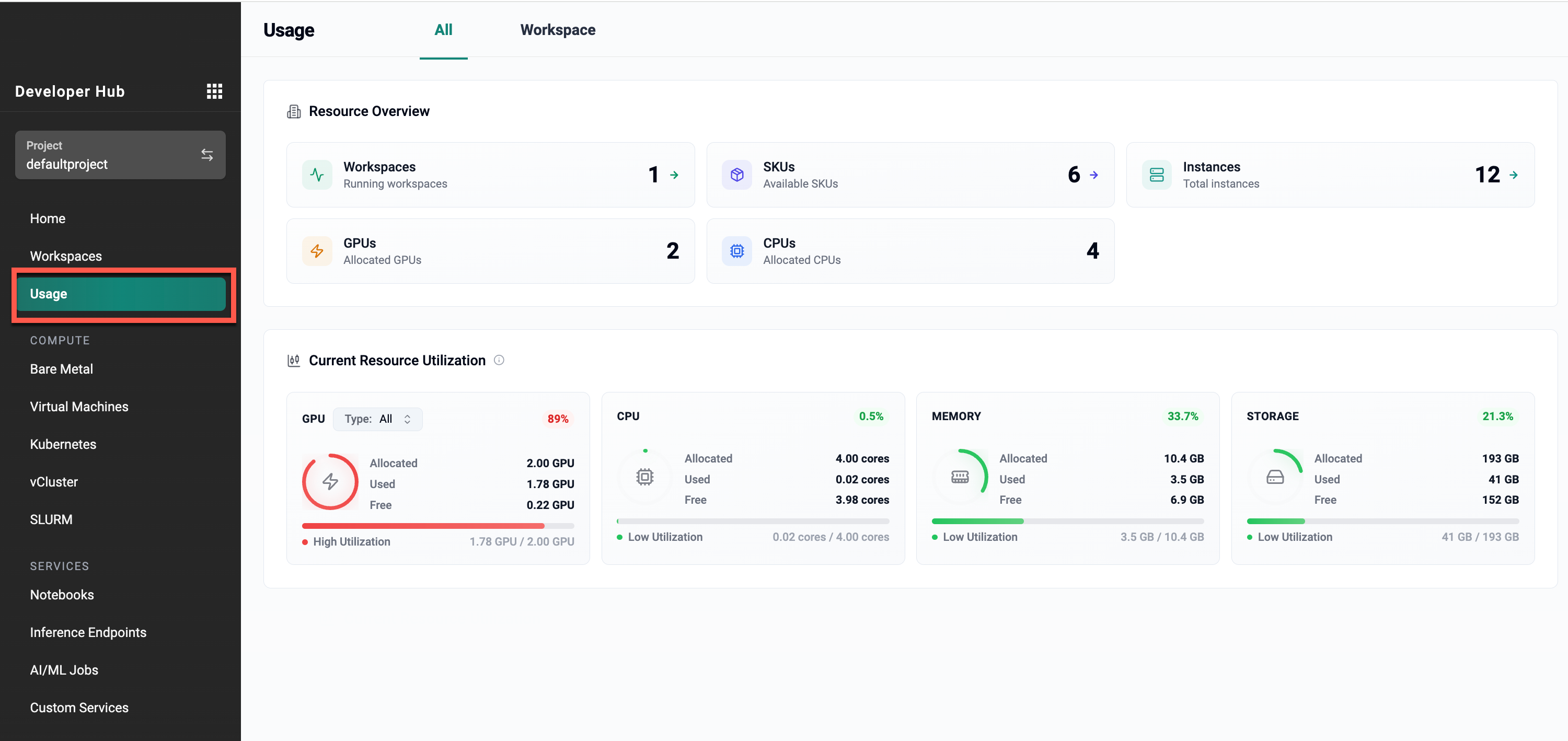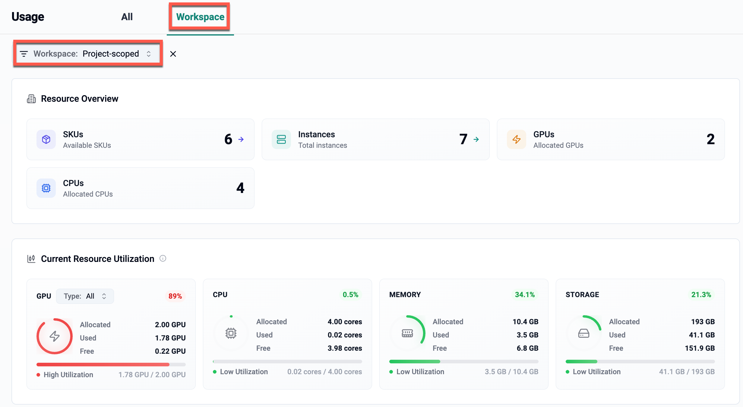 This view presents an aggregated, project-level summary of resource usage across all accessible workspaces and project-scoped instances.