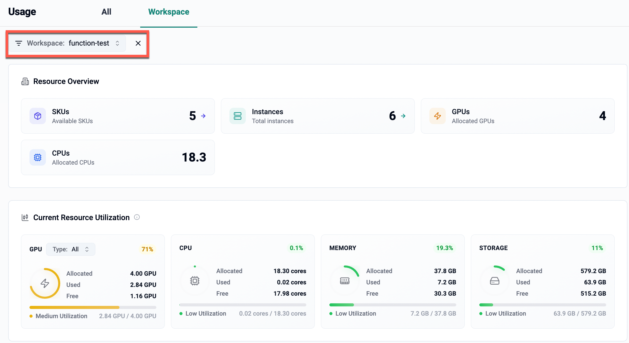 When a specific workspace is selected, the dashboard displays resource usage and instance data only for that workspace.