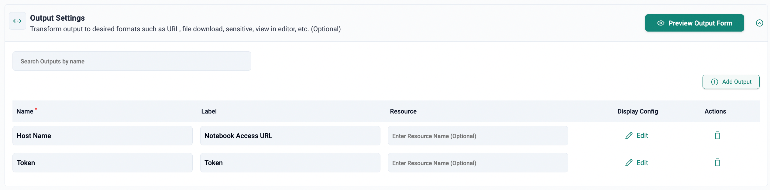 - Navigate to Output Settings and click Add Output. When creating the notebook service profile, the PaaS Admin can define outputs such as Host Name, Token, or other required details. These outputs are displayed to the end users after they deploy the notebook service, allowing them to access and use the service.
