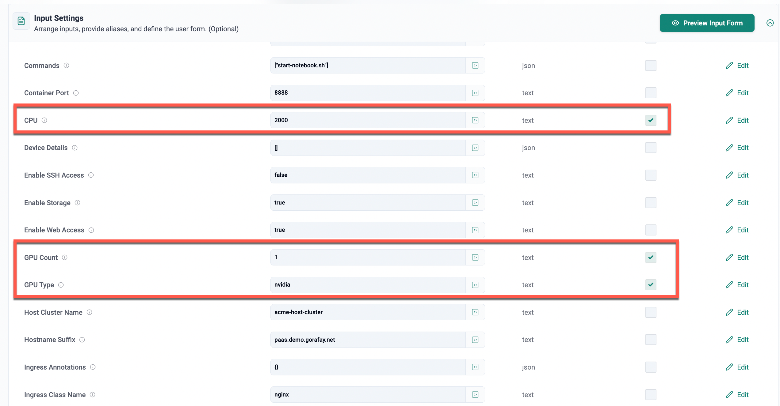 - Resource settings: CPU request, CPU limit, memory request, memory limit, GPU limit, PVC storage