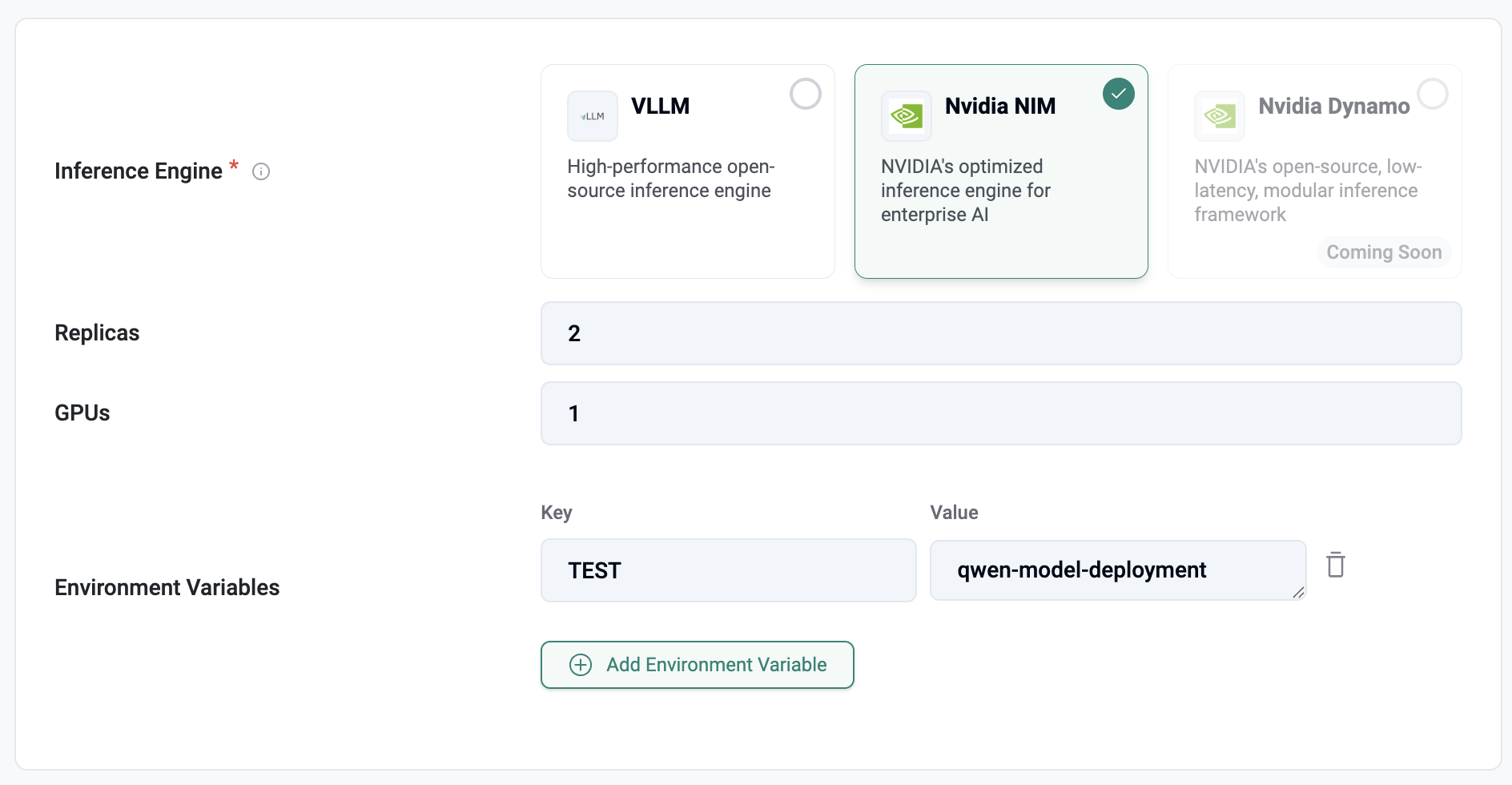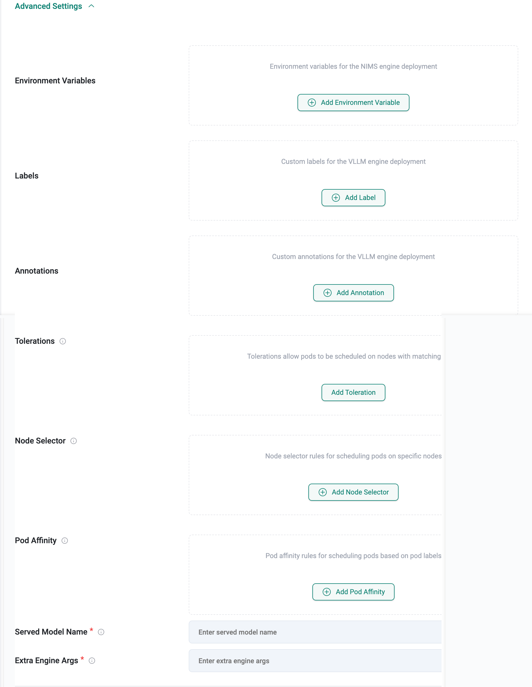 Admins can also fine tune/optimize the vLLM inference engine by providing "custom environment variables". For example, vLLM's environment variable's documentation is available here