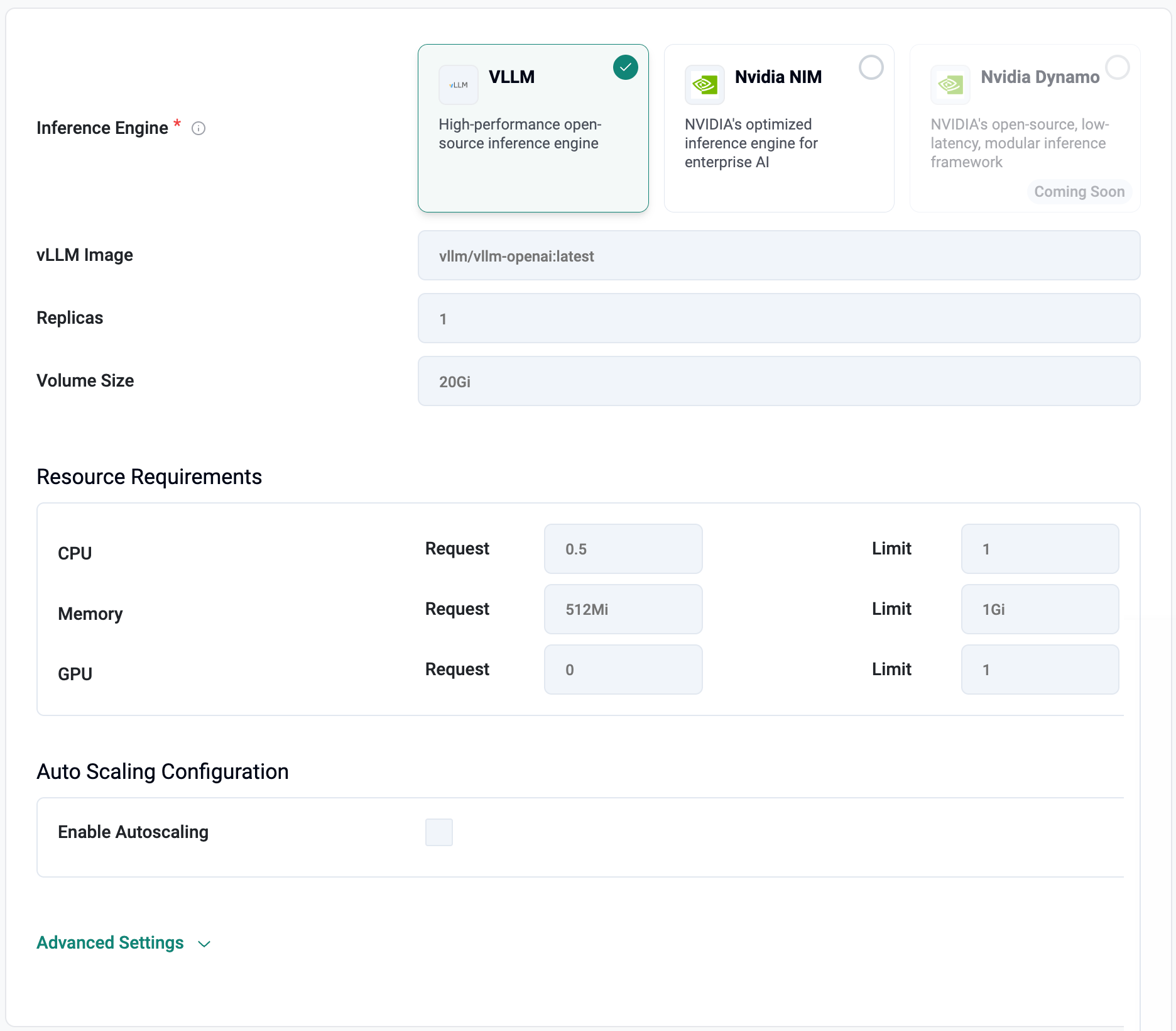 In this step, the admin has to select their preferred Inference engine. Three options are currently supported: