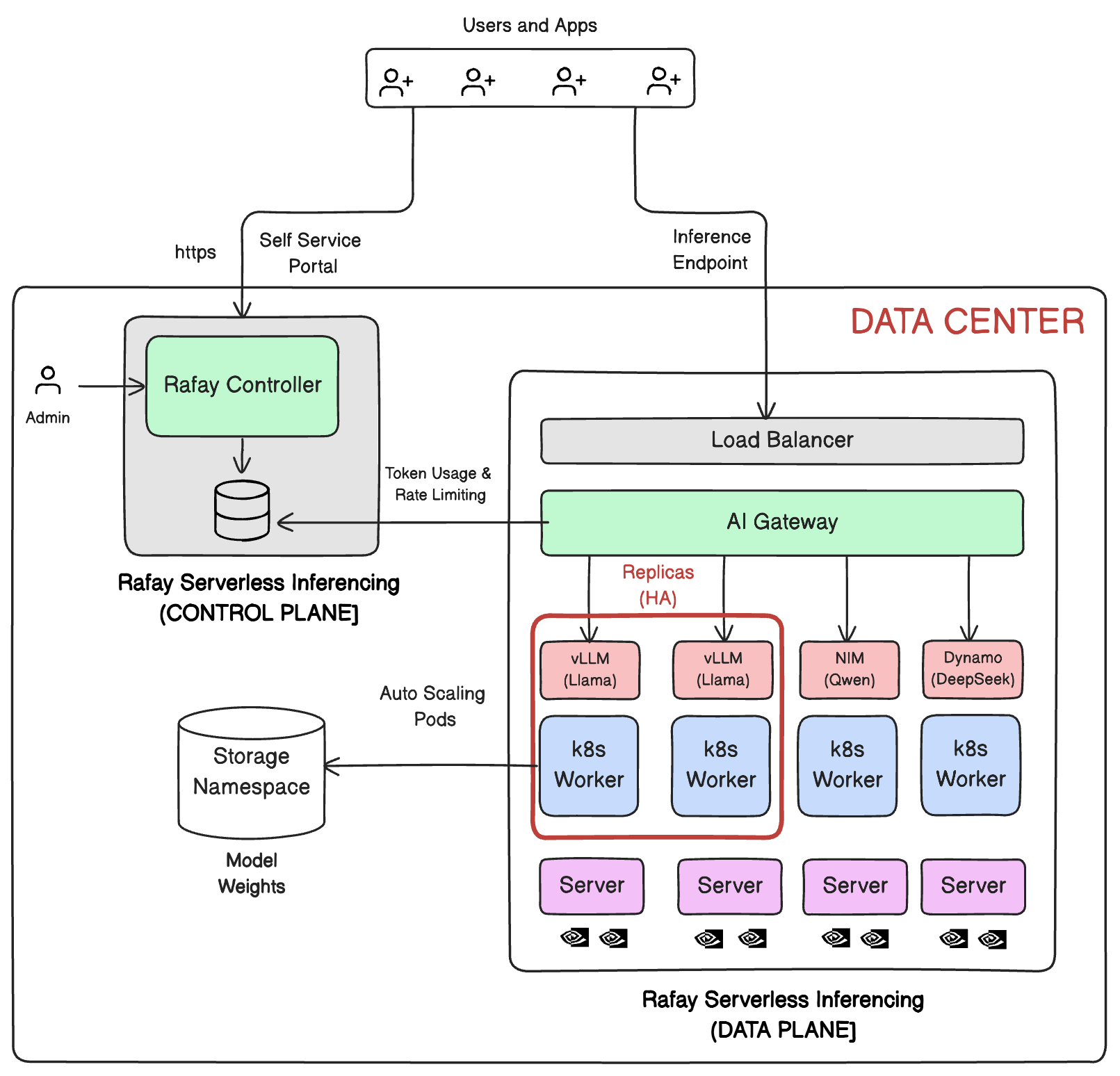 The data plane is where the actual inference requests from users are handled and processed. This will be a number of GPU servers running in a datacenter. We will deploy Rafay MKS (Upstream Kubernetes) on the servers and will act as the substrate for the data plane software components of the Serverless Inference solution.