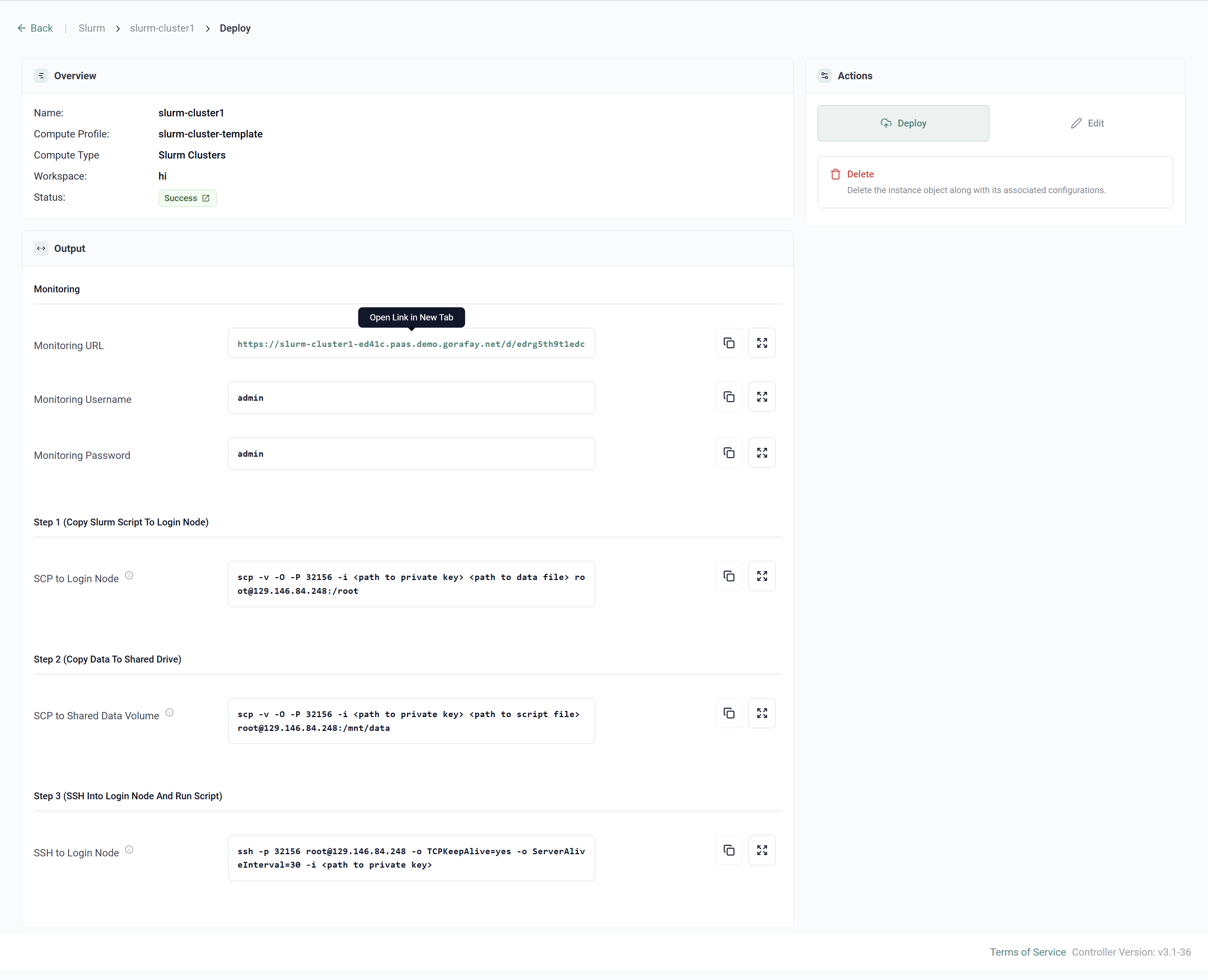 After approximately 5 minutes, the SLURM Cluster will be fully provisioned. Once the cluster has finished deploying, the user will be presented with the following information to access the cluster.