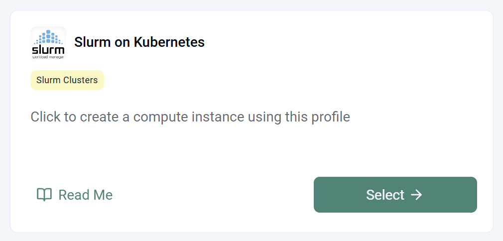 • Choose Slurm on Kubernetes from the available options and click Select to continue