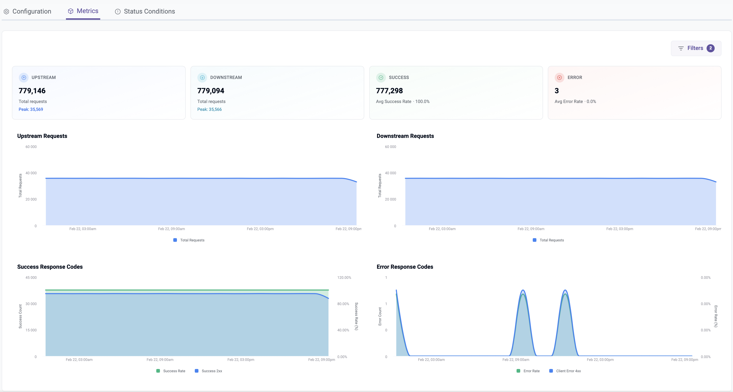 Click the Metrics tab in the Endpoint to view critical metrics. Summary and Trends for the following are available to operators.