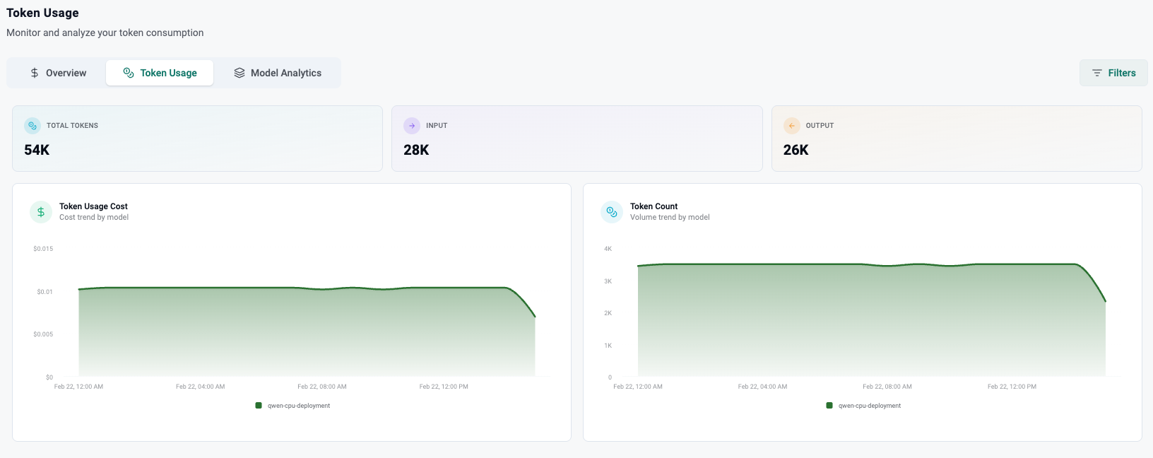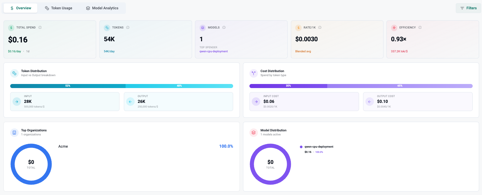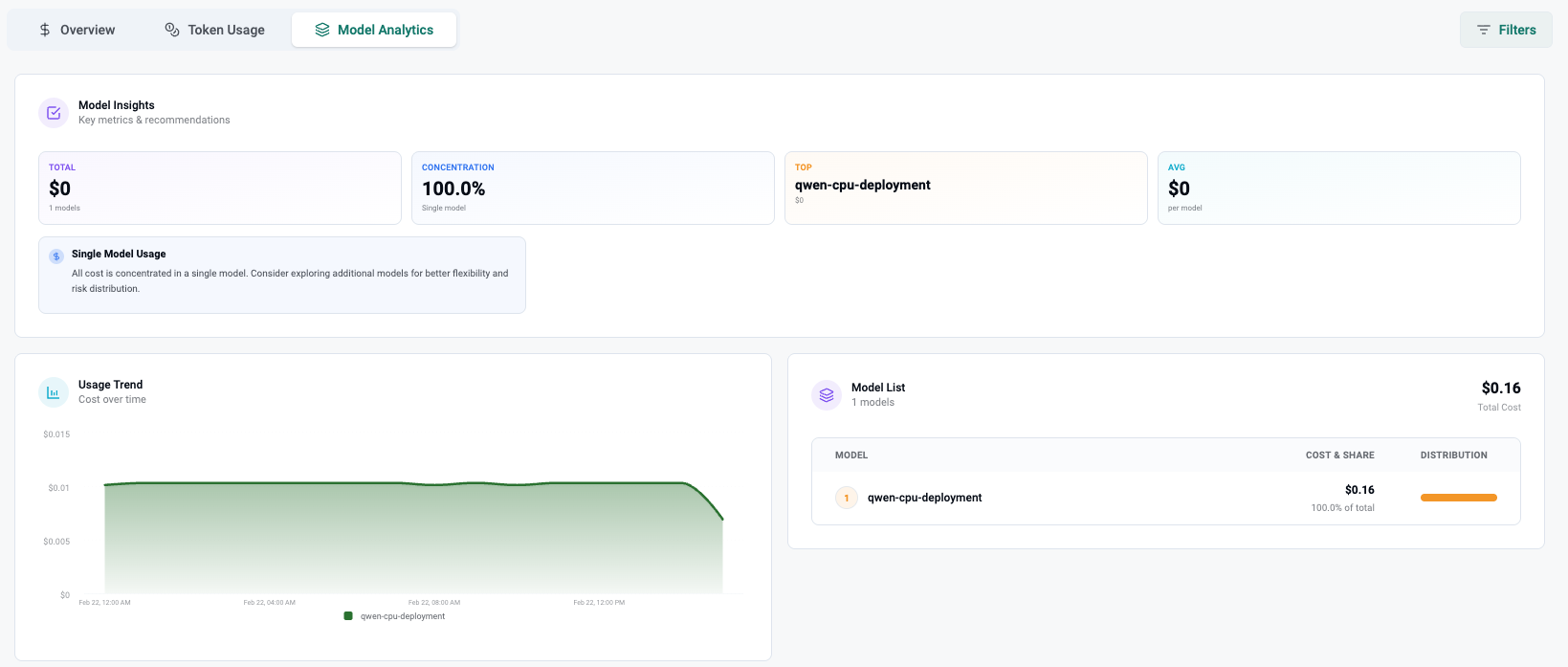 This dashboard empowers platform and AI teams to optimize model efficiency, control operational costs, and make data-driven decisions about scaling, model selection, and workload optimization.