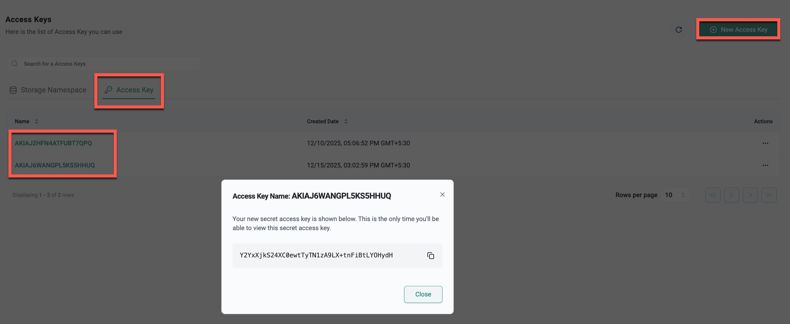 A new access key is generated automatically.