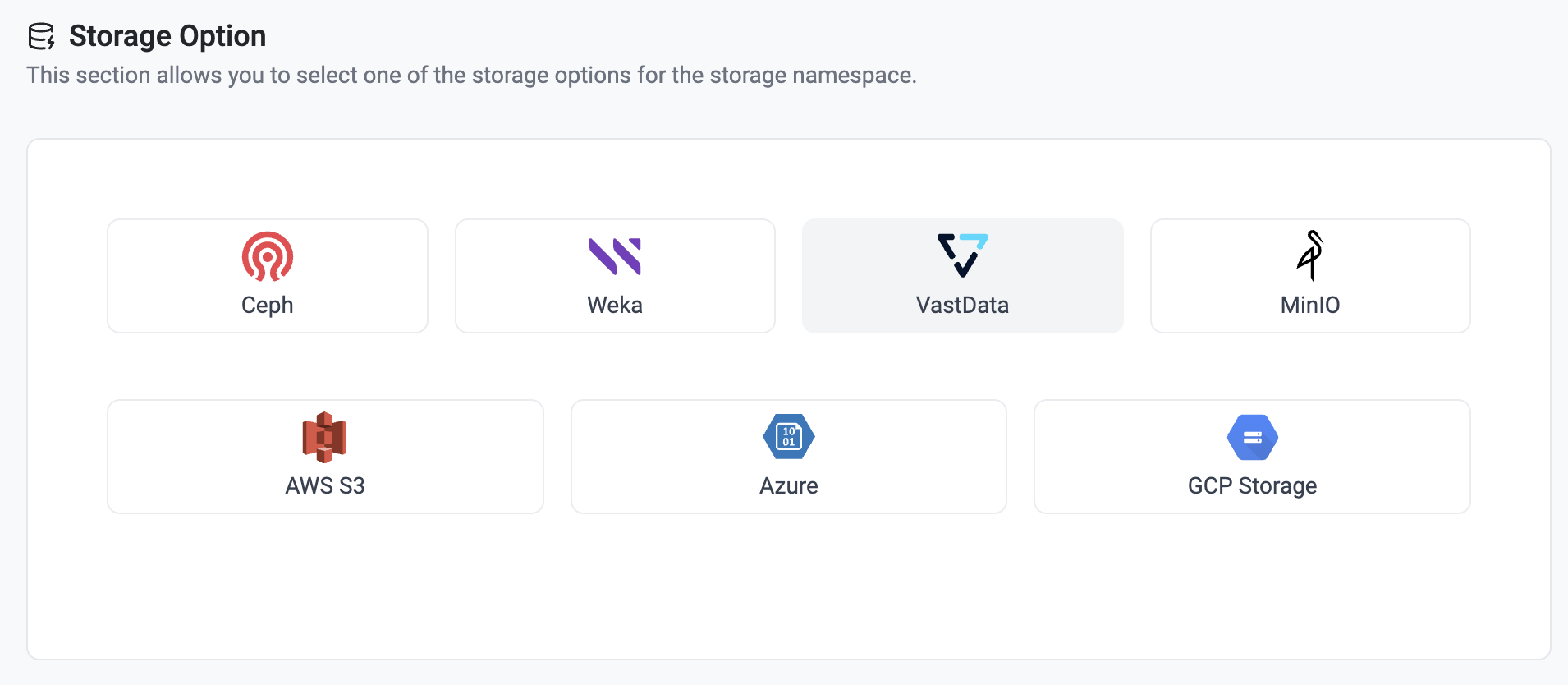 Storage namespaces support multiple backend types, depending on customer infrastructure, including: