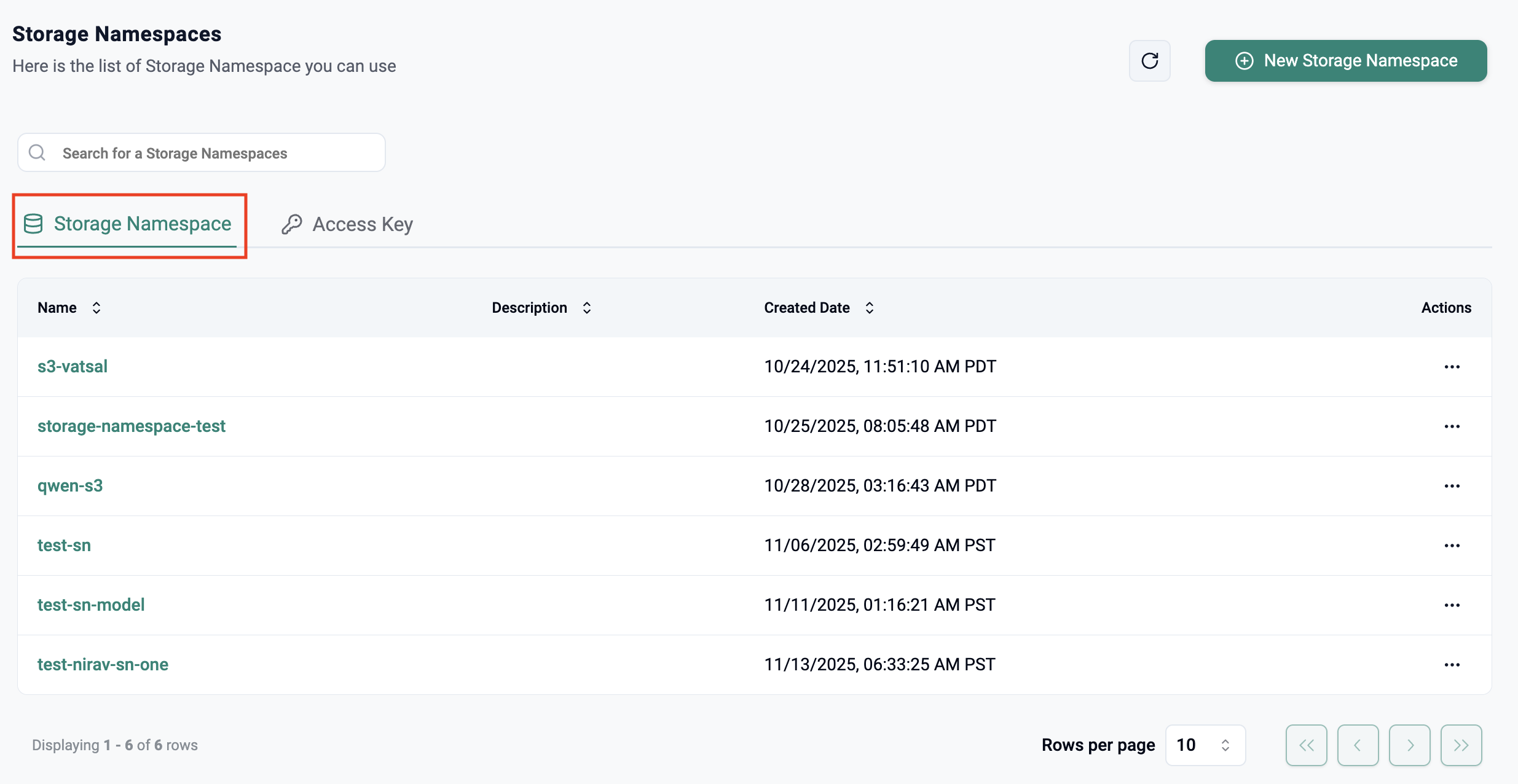 This page displays the list of all storage namespaces.