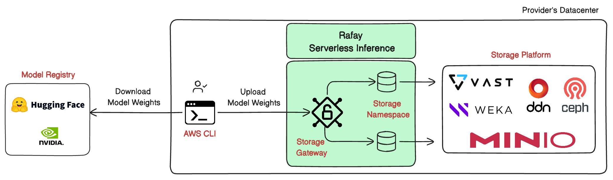 A Storage Namespace provides the storage backend used for hosting GenAI model artifacts such as model weights, tokenizer files, and related metadata. Storage namespaces allow models to be loaded efficiently into GPU memory and avoid repeated downloads from remote repositories.