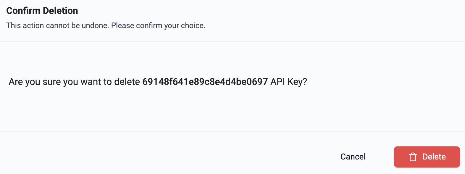 This action is not reversible. You cannot recover the API Key once it has been deleted.