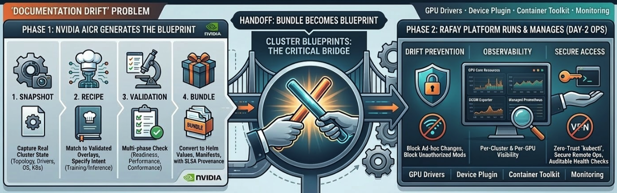 Together, they close the loop from raw GPU hardware to production-managed, validated, drift-proof AI infrastructure — with cluster blueprints as the architectural bridge between generation and operation.
