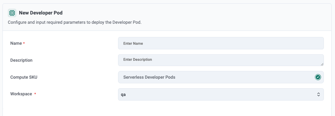 The end user logs into Rafay's Self Service Portal. Once they select Developer Pods, the user is taken to straightforward configuration form. They are asked to provide the following: