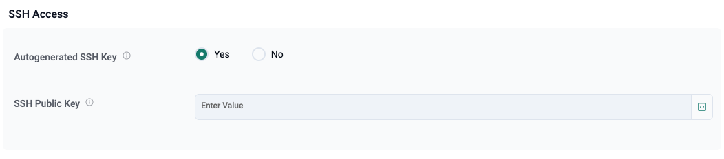 Developer Pods supports this directly through SSH configuration. In the example below, the user can choose whether to auto-generate an SSH key or provide their own public key.