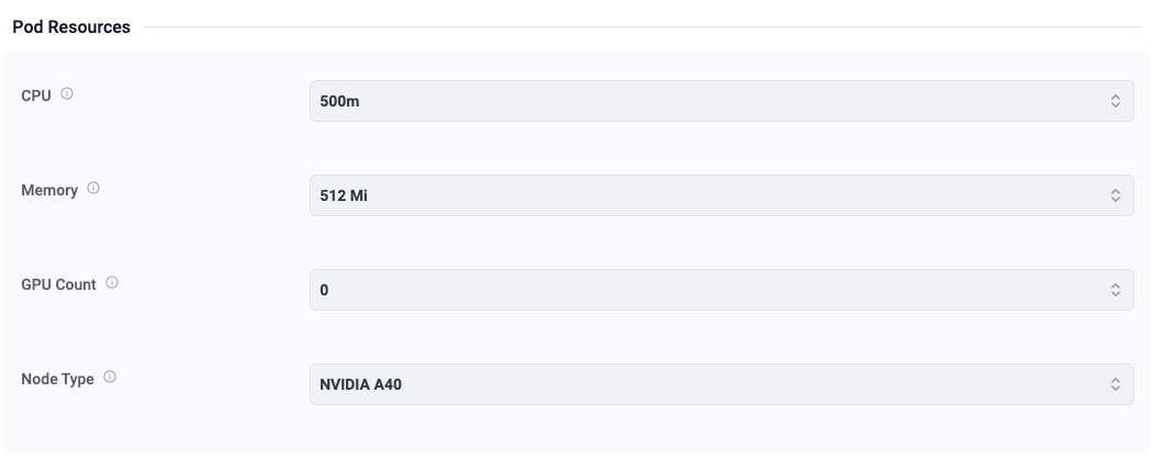 The next step in the workflow allows the user to specify the compute resources for their Developer Pod. In this example, the user can configure: