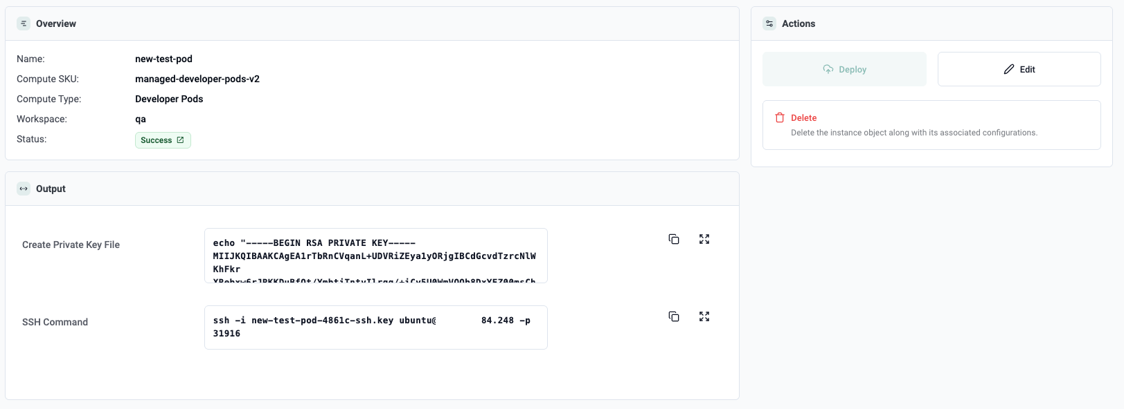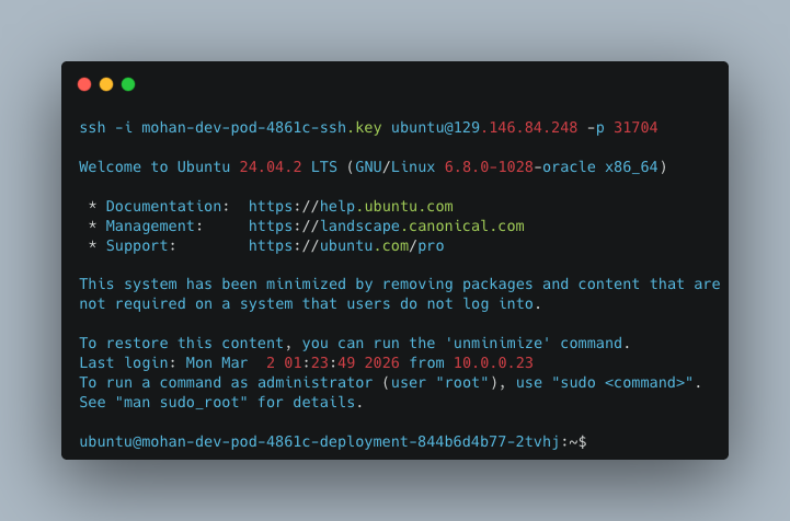 Then comes the moment that matters most. They connect to the environment and start working. In the example below, the pod is reachable over SSH and the user lands directly in an Ubuntu environment.