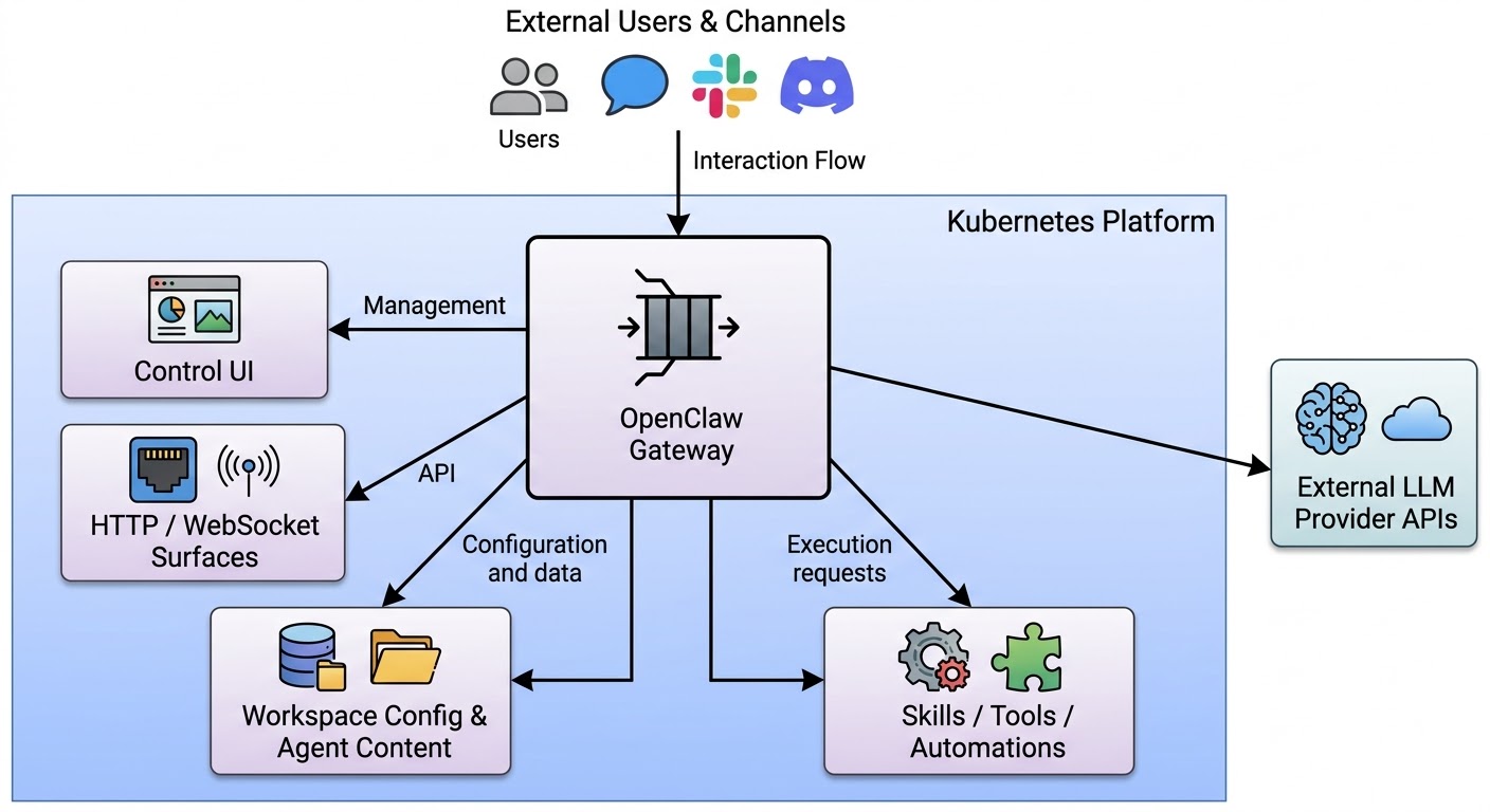 For platform teams, that makes OpenClaw more than an AI app. It looks like an AI gateway layer that can be deployed, secured, and managed on Kubernetes using the same operational patterns you would use for internal developer platforms, control planes, or multi-service middleware.