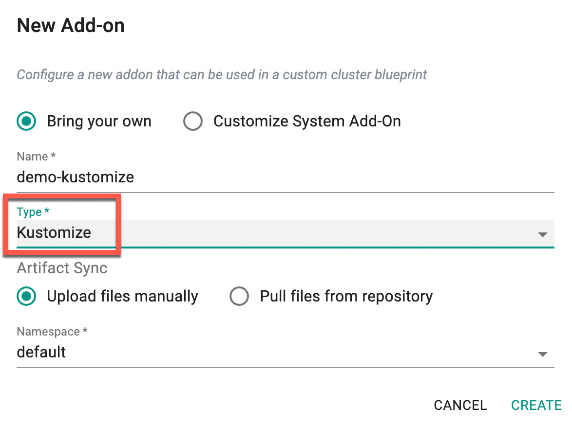 - k8s YAML: This falls in the line of packaging your own and this should be used when an admin wants to supply standard Kubernetes YAML to define the software add-on. In addition, these add-on types can be managed via GitOps processes by pulling the appropriate files from a Git repository.