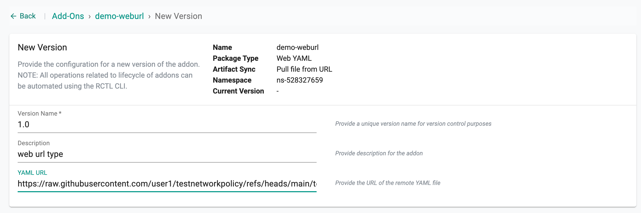 1.0) and an optional Description for the add-on version. - In the YAML URL field, provide the complete URL of the remote YAML file.