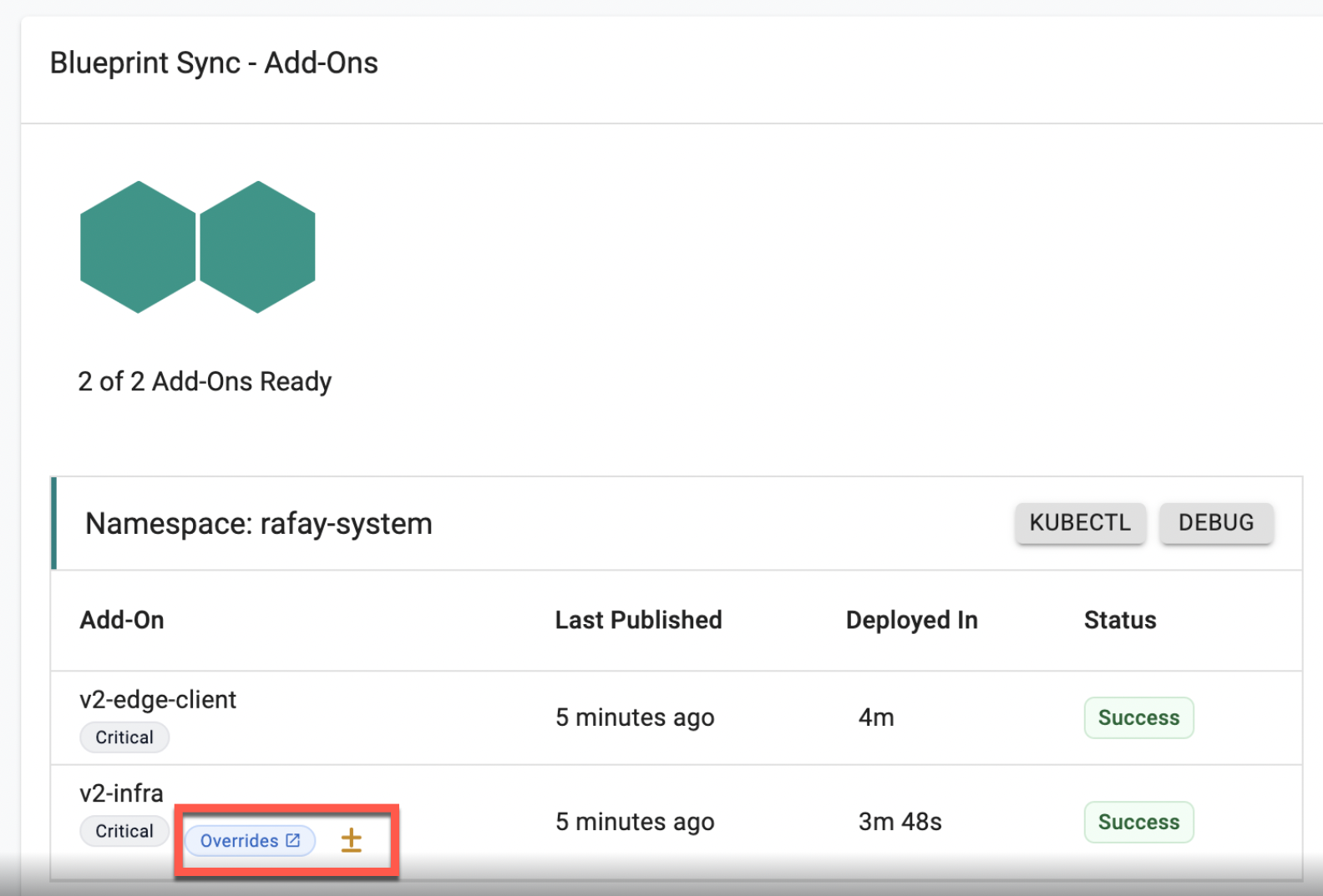 During the blueprint sync, the system evaluates the override configuration and applies the updated values defined in the override file. The Add-Ons view displays an Overrides indicator for components where override values are applied. This confirms that the override configuration has been processed during the sync.
