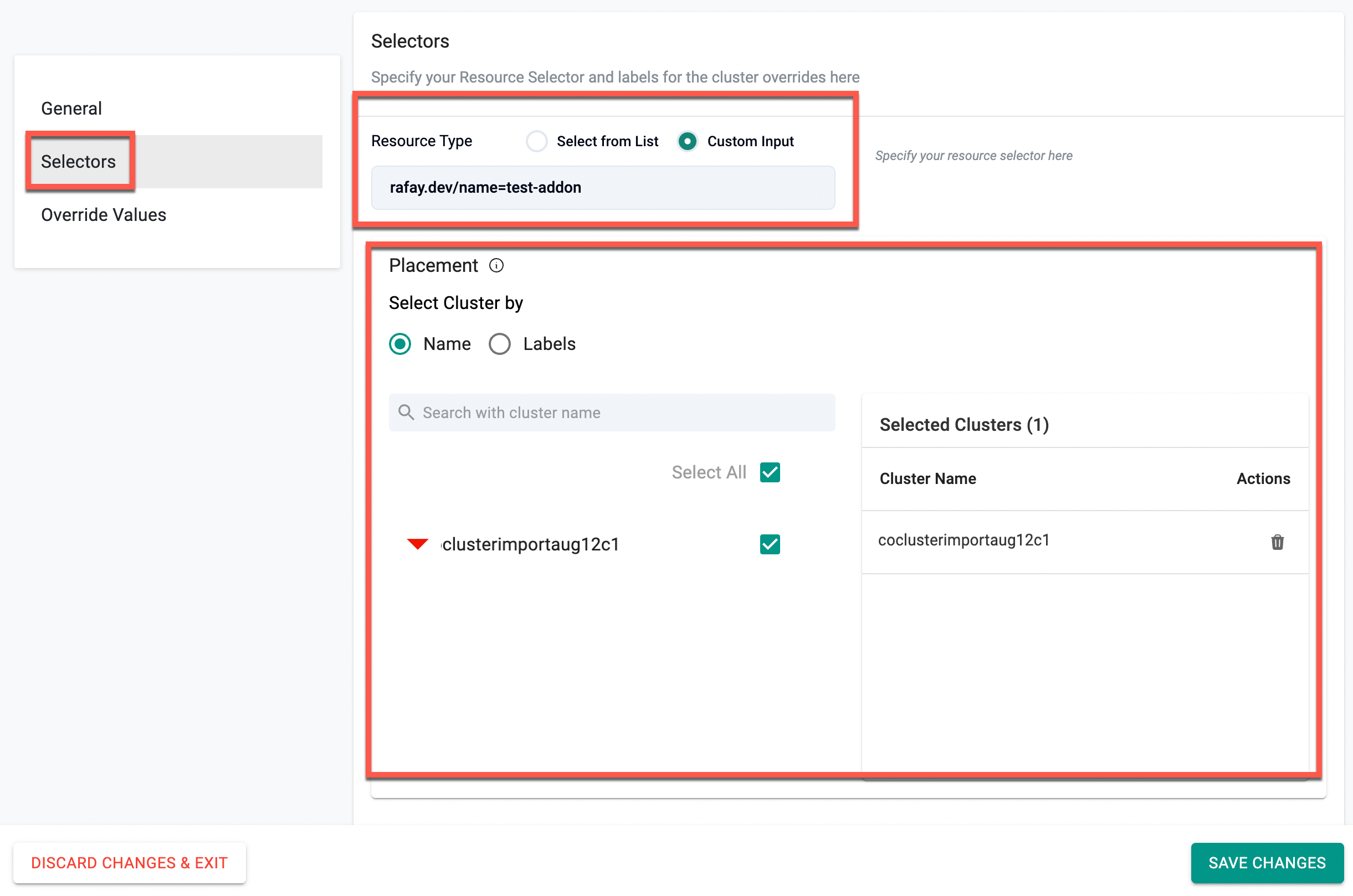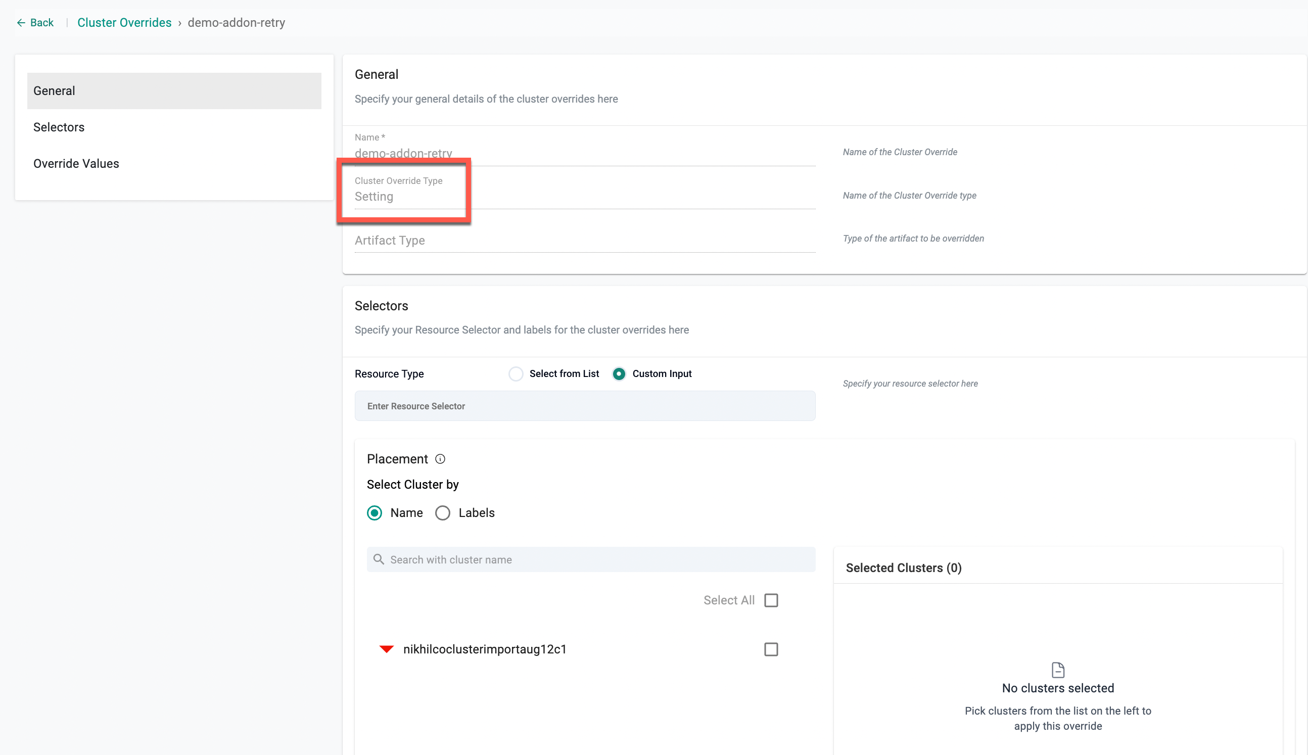 - For the Resource Selector, choose the addon for which the cluster override will be applied.