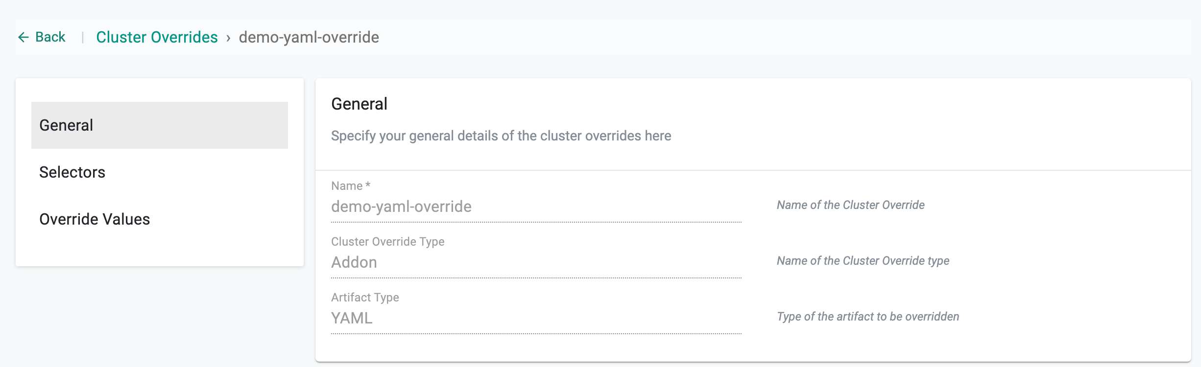 - Click New Override and provide a name. By default, the Cluster Override Type is selected as Addon