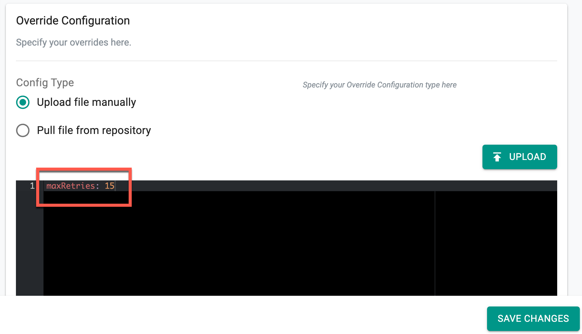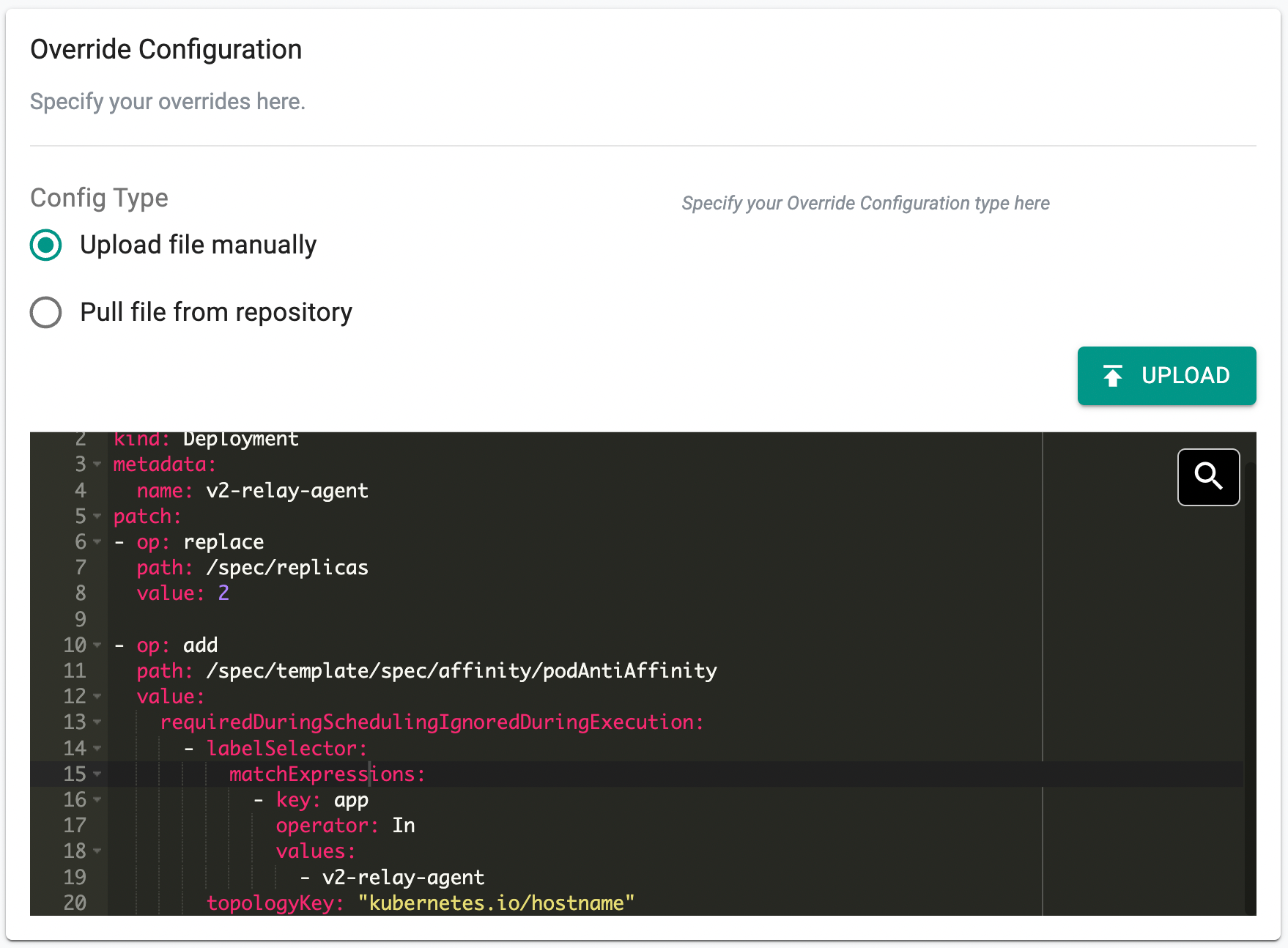 Override Configuration allows the users to specify the override values and apply the values to one or more clusters. You can either provide the values manually or pull file from repository. By default, Upload file Manually is selected.