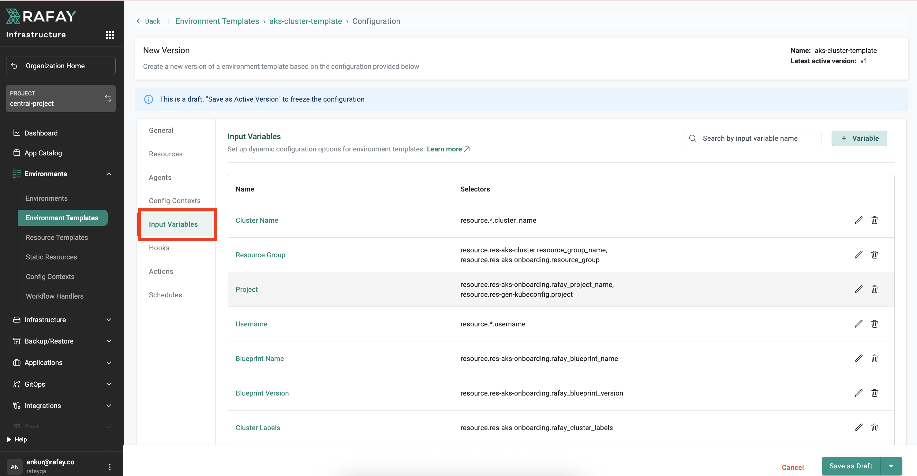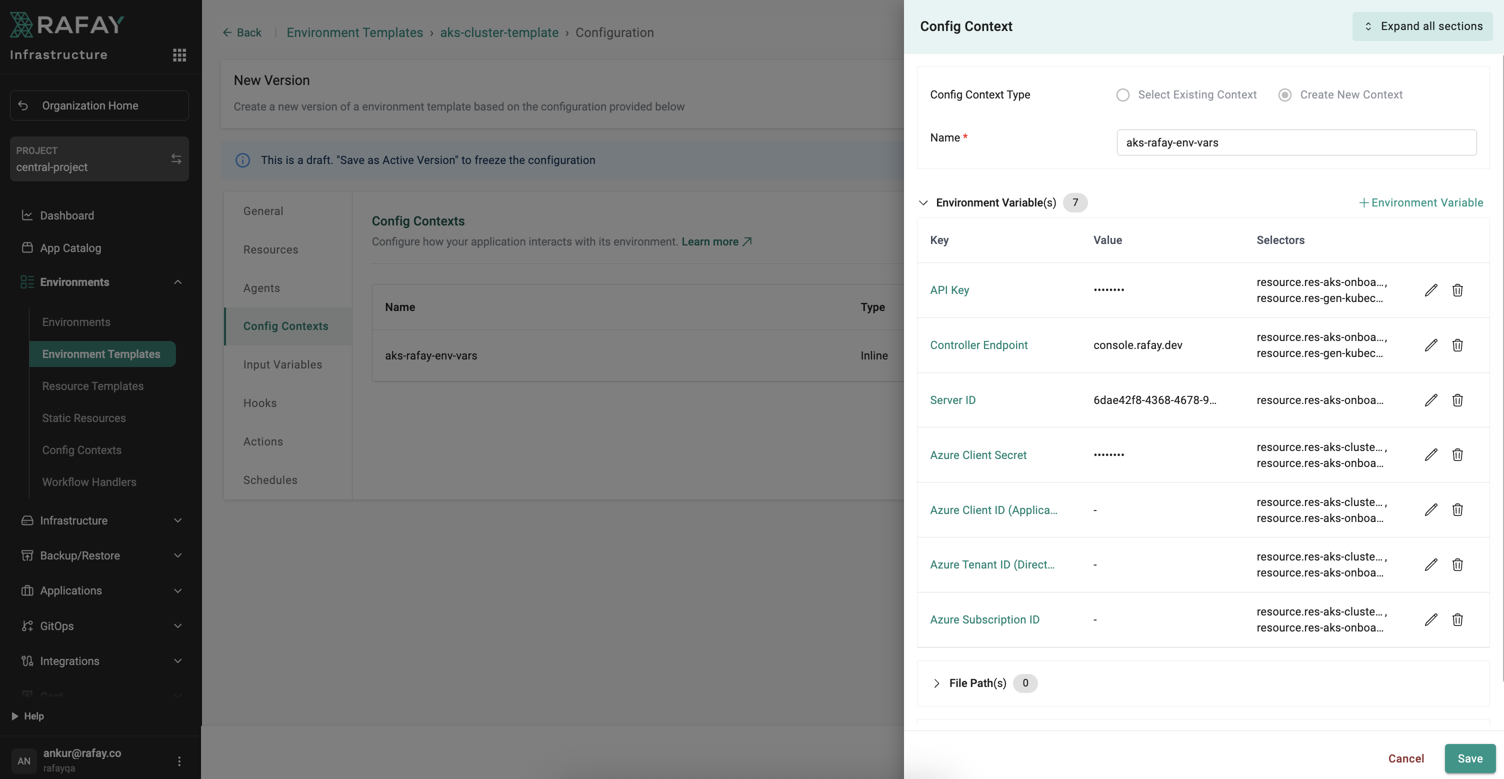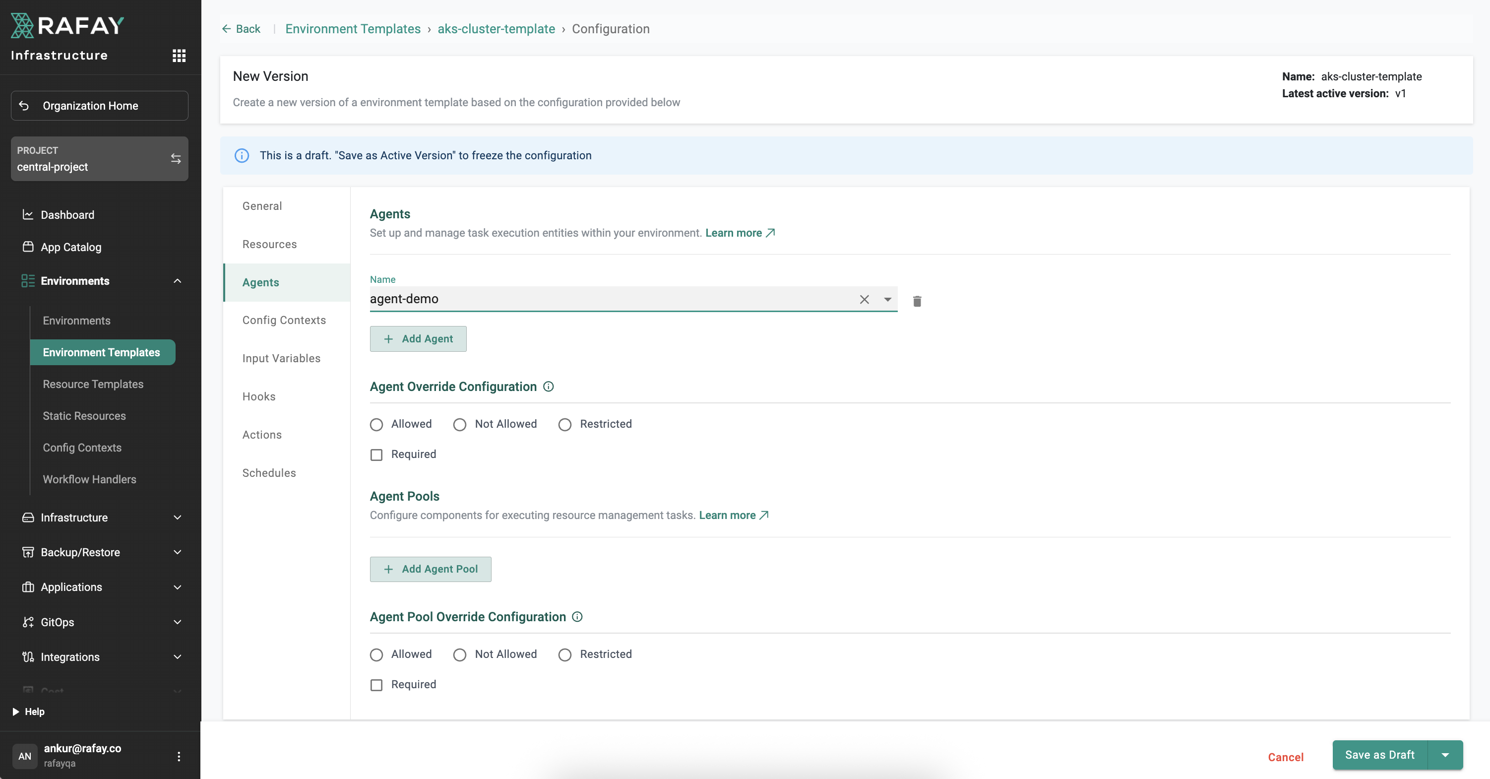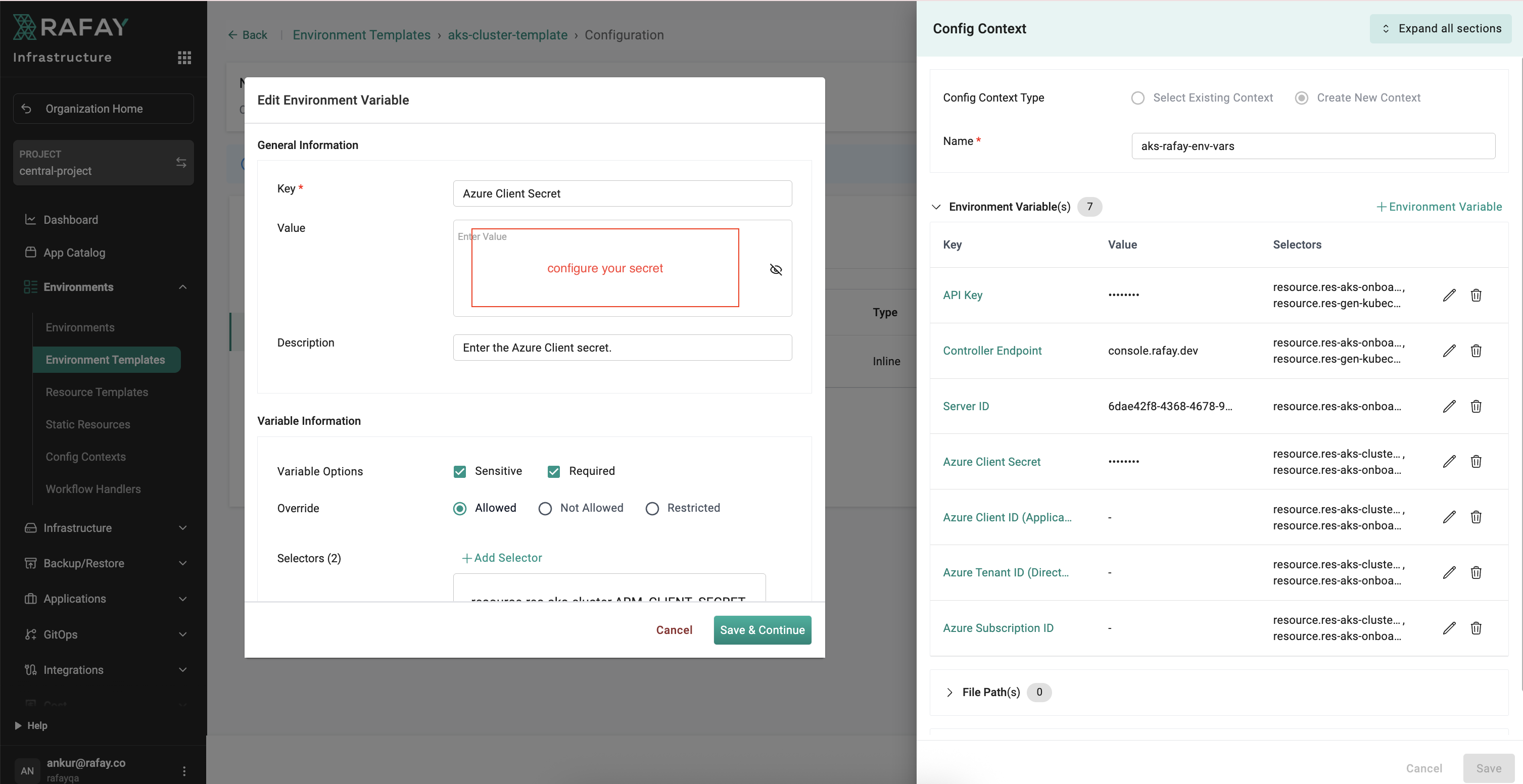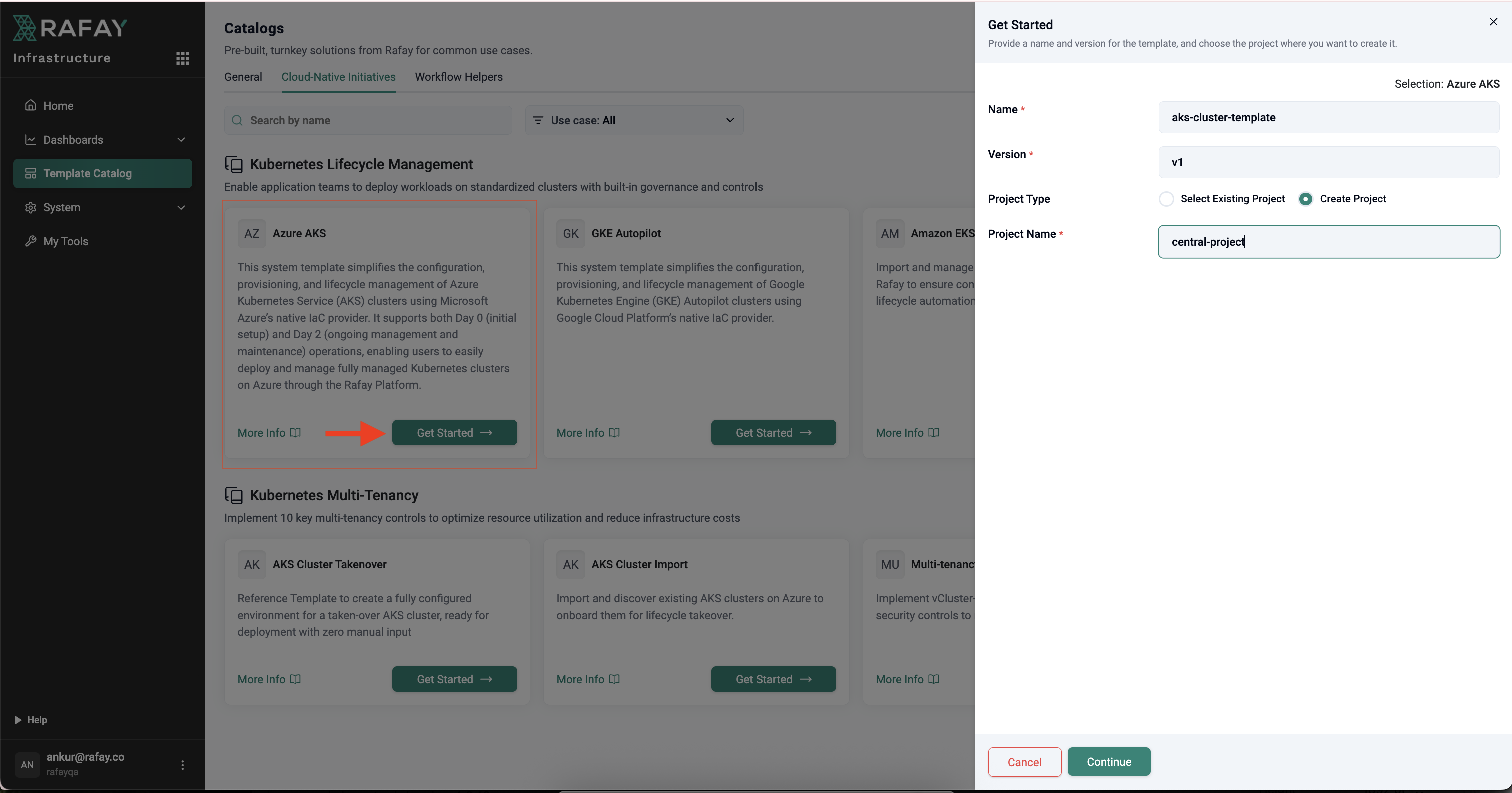 Once the Azure AKS template is shared to your central project, configure the essential components: