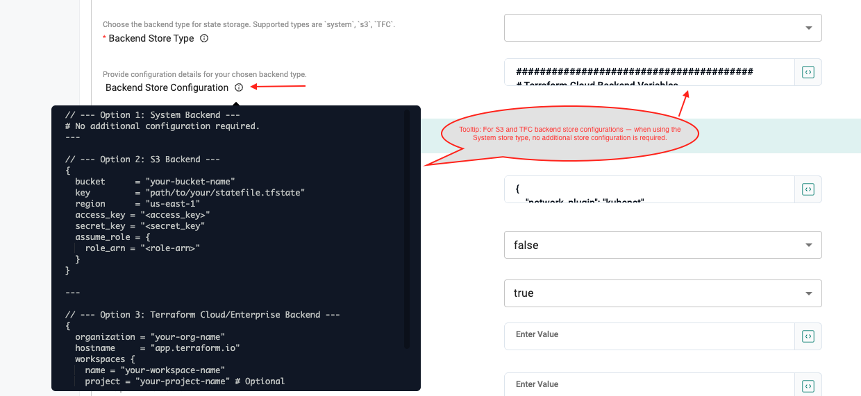 The Backend Store Configuration field displays a tooltip that shows only the configuration fields relevant to your selected backend store type (S3 or TFC). This ensures you only see and configure the necessary settings for your chosen backend store.