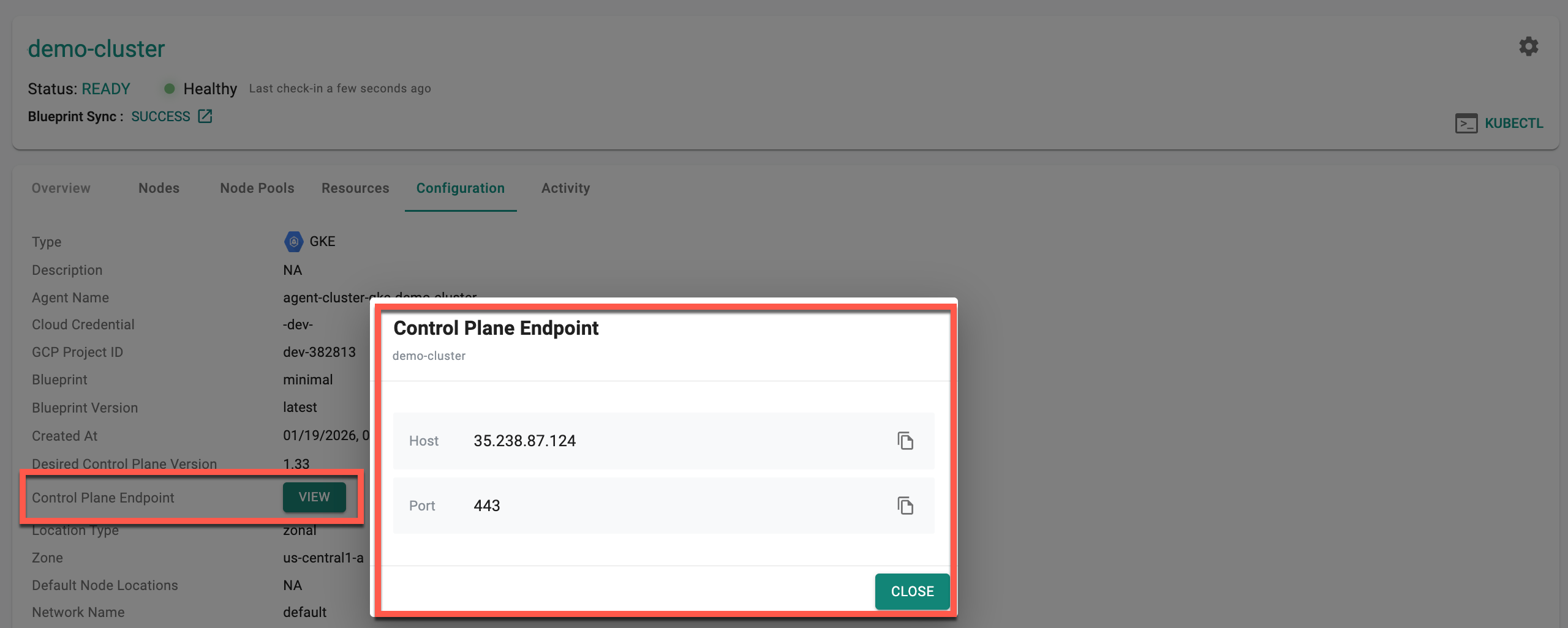 Click View in the Control Plane Endpoint field to view the control plane host IP address and port for the GKE cluster.